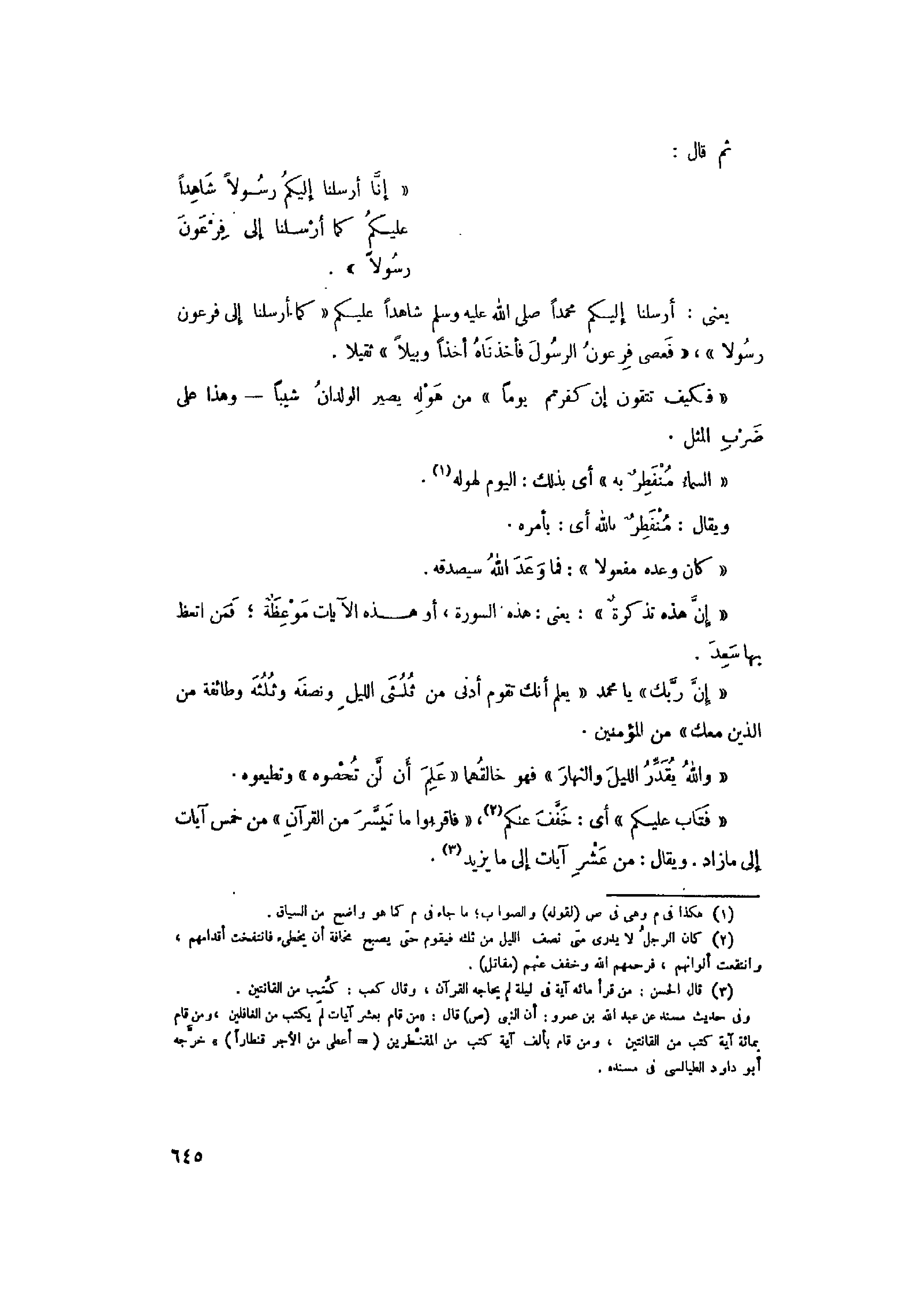 (2) كان الرجل لا يدرى متى نصف الليل من ثلثه فيقوم حتى يصبح مخافة أن يخطىء فانتفخت أقدامهم، وانتقعت ألوانهم، فرحمهم الله وخفف عنهم (مقاتل) .