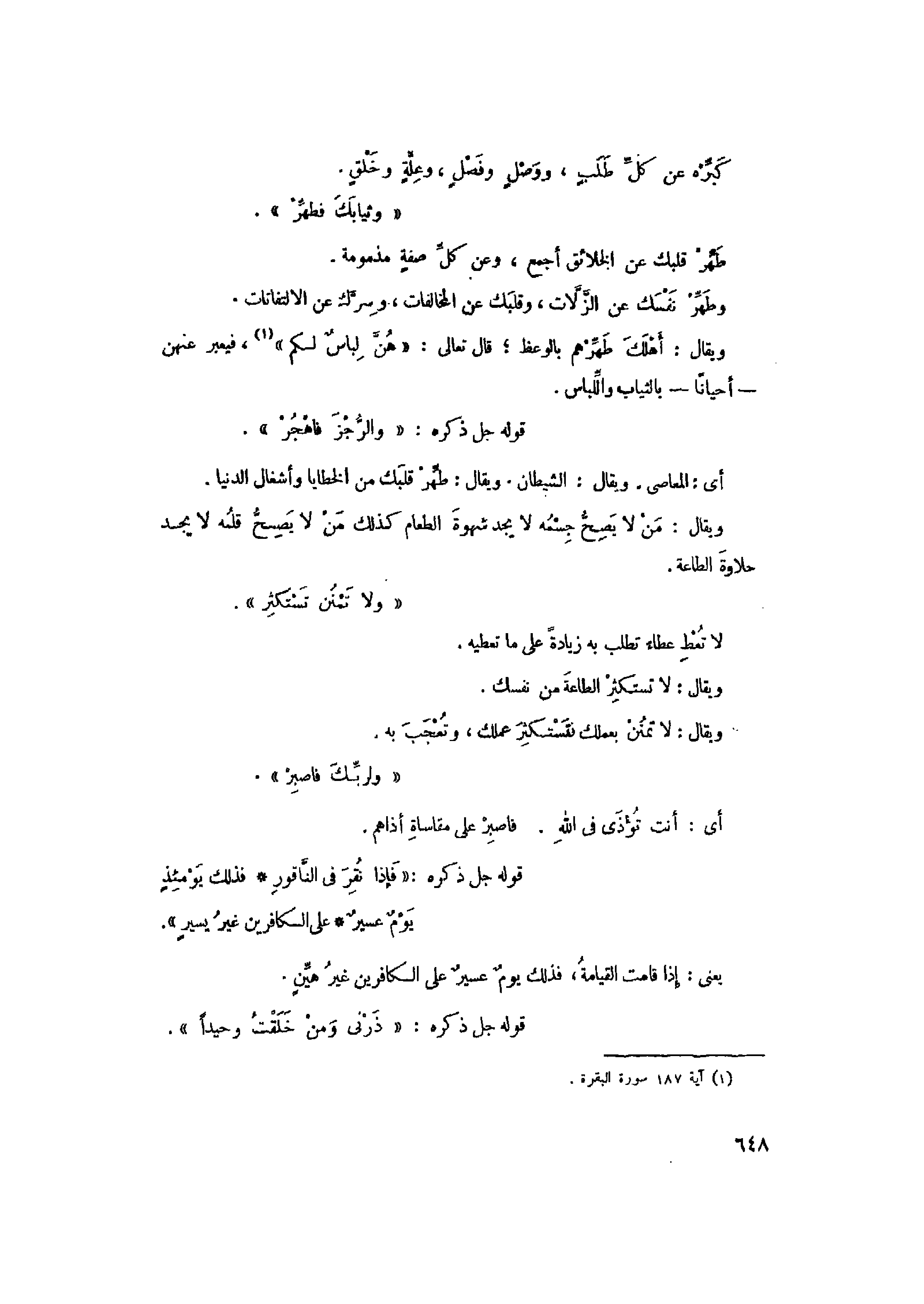 «وَثِيابَكَ فَطَهِّرْ» طهّر قلبك عن الخلائق أجمع، وعن كلّ صفة مذمومة.