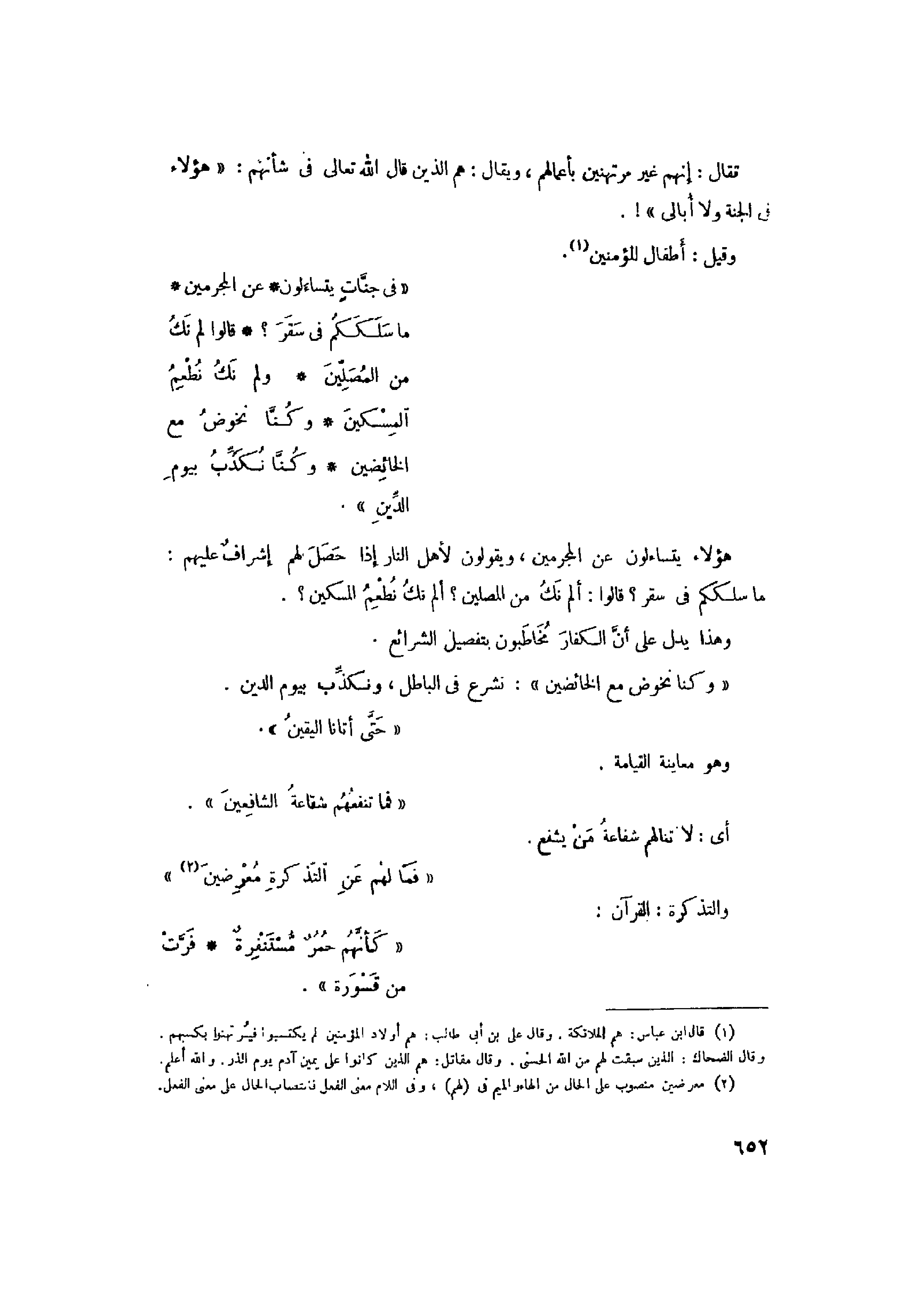 (1) قال ابن عباس: هم الملائكة. وقال على بن أبى طالب: هم أولاد المؤمنين لم يكتسبوا فيرتهنوا بكسبهم.