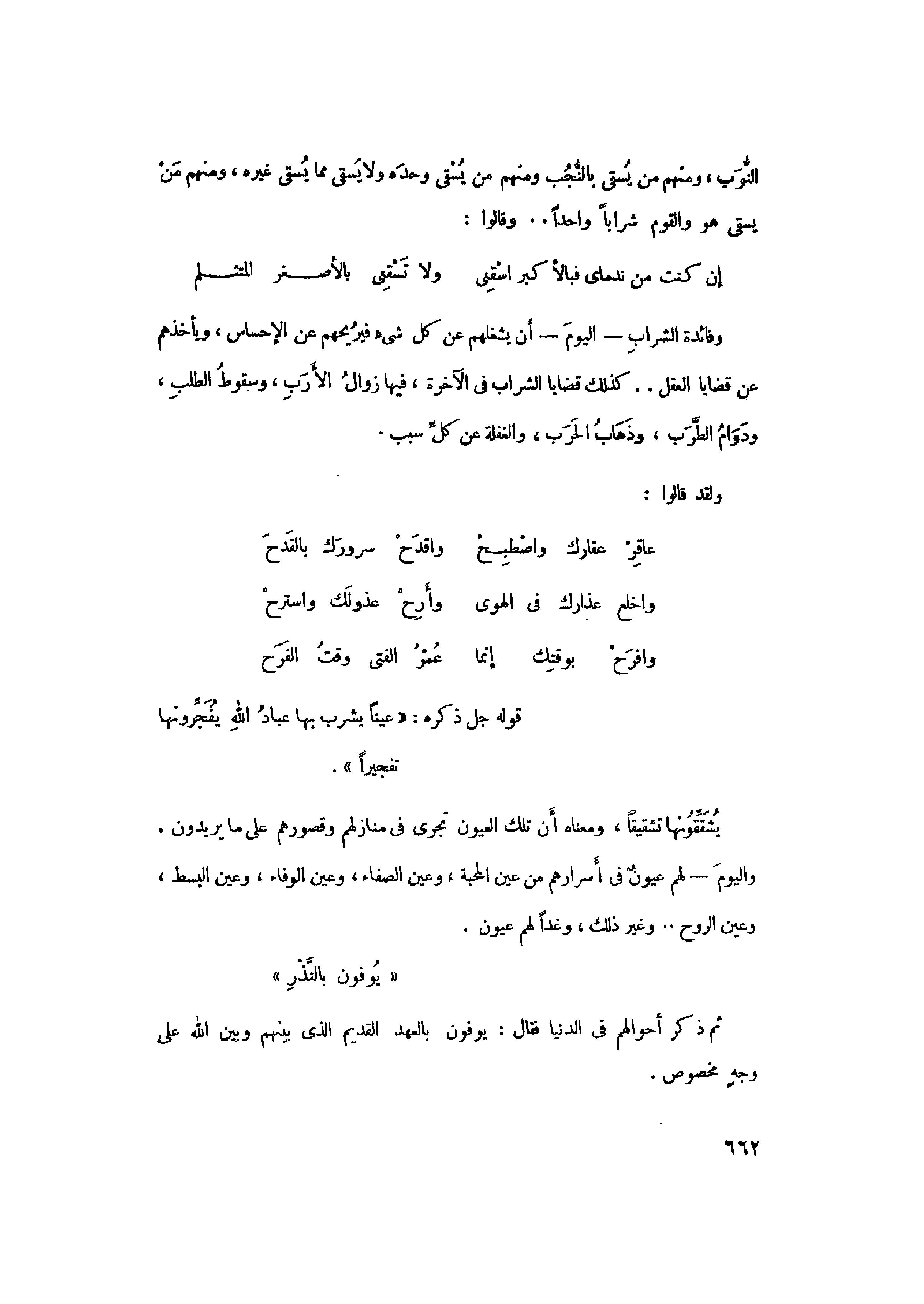 وفائدة الشراب- اليوم- أن يشغلهم عن كل شىء فيريحهم عن الإحساس، ويأخذهم عن قضايا العقل.. كذلك قضايا الشراب في الآخرة، فيها زوال الأرب، وسقوط الطلب، ودوام الطّرب، وذهاب الحرب، والغفلة عن كلّ سبب.