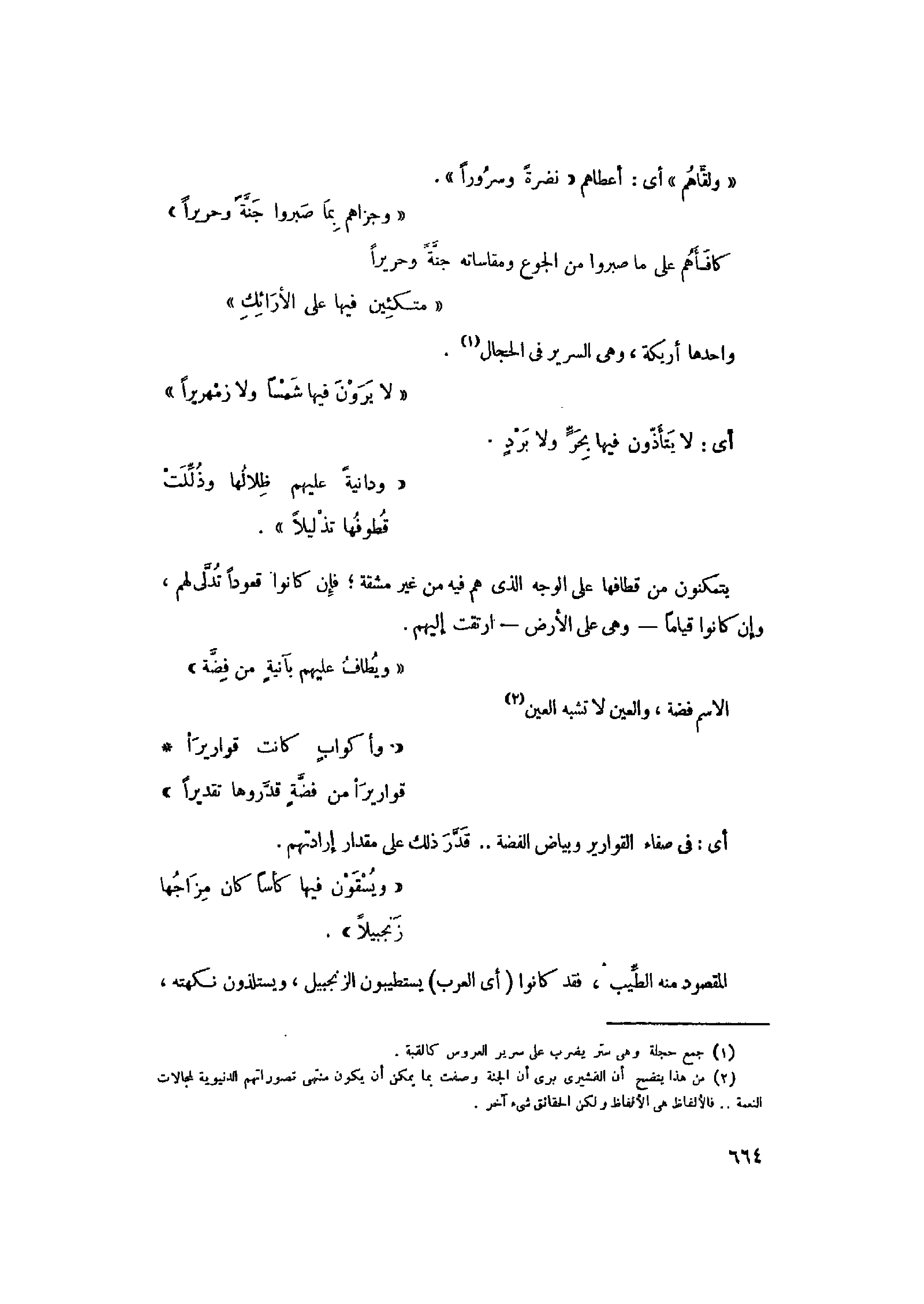 (2) من هذا يتضح أن القشيري برى أن الجنة وصفت بما يمكن أن يكون منتهى تصوراتهم الدنيوية لمجالات النعمة ... فالألفاظ هي الألفاظ ولكن الحقائق شىء آخر.