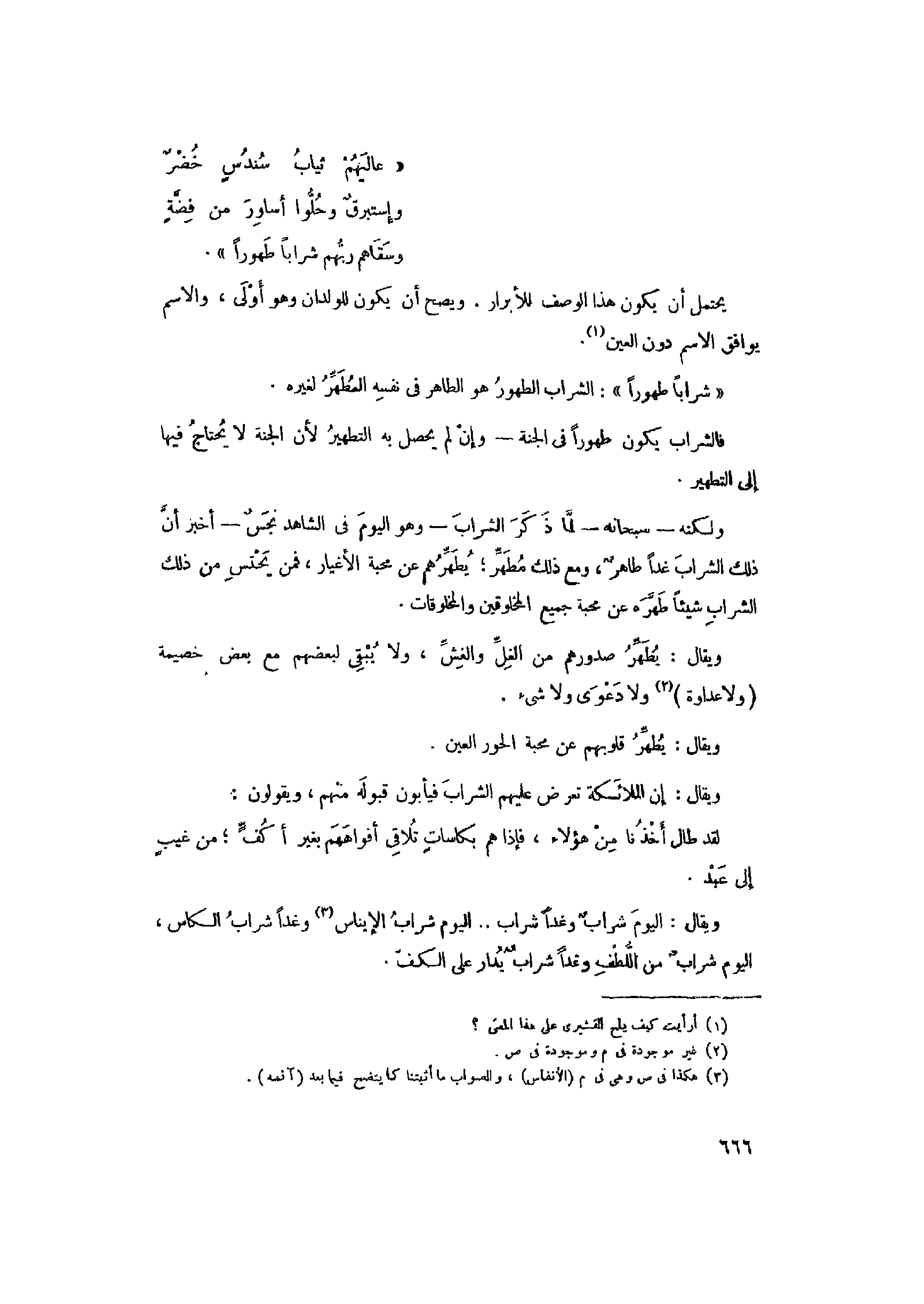 «عالِيَهُمْ ثِيابُ سُندُسٍ خُضْرٌ وَإِسْتَبْرَقٌ وَحُلُّوا أَساوِرَ مِنْ فِضَّةٍ وَسَقاهُمْ رَبُّهُمْ شَراباً طَهُوراً» يحتمل أن يكون هذا الوصف للأبرار. ويصح أن يكون للولدان وهو أولى، والاسم يوافق الاسم دون العين «1» .