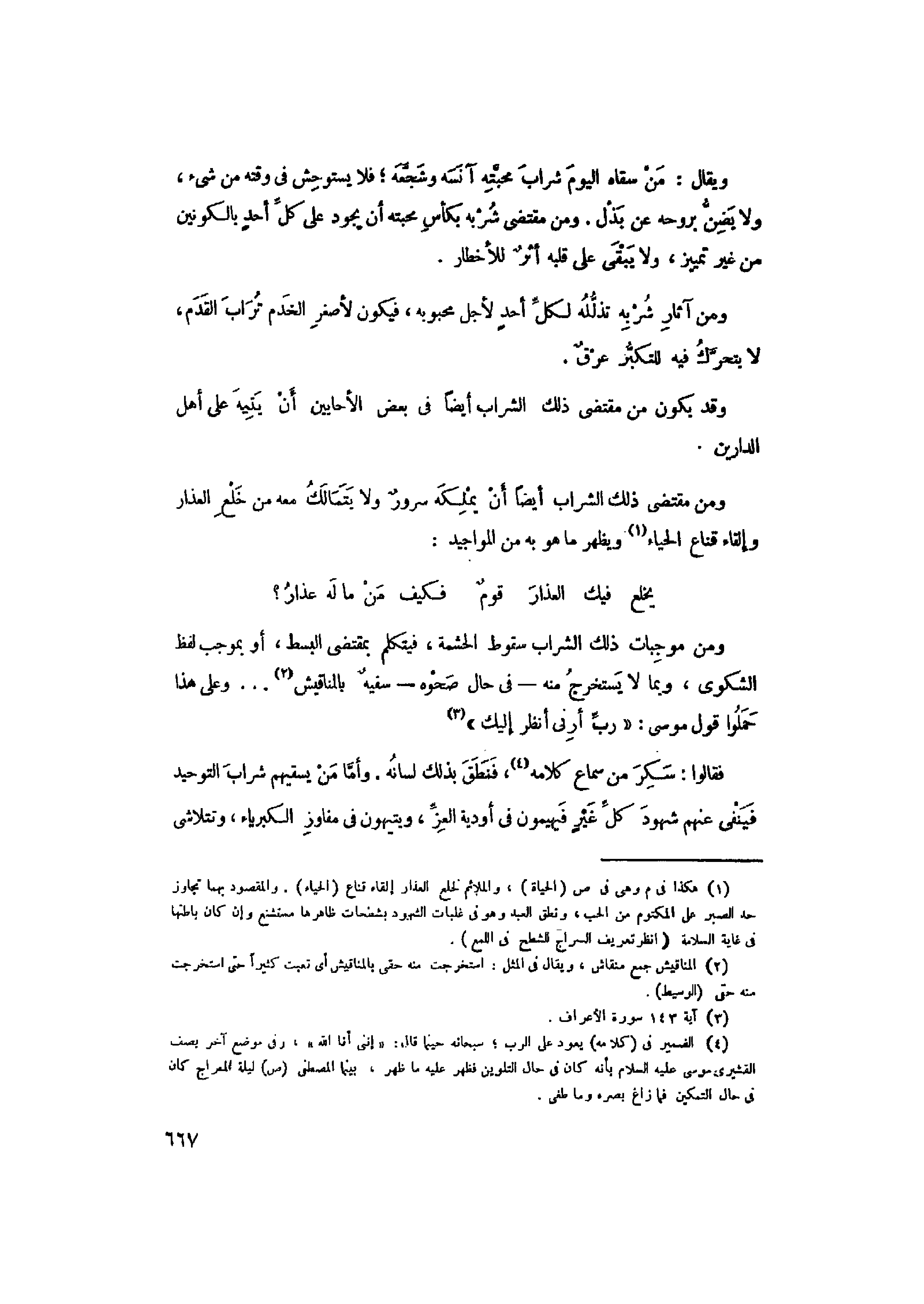 ومن موجبات ذلك الشراب سقوط الحشمة، فيتكلم بمقتضى البسط، أو بموجب لفظ الشكوى، وبما لا يستخرج منه- فى حال صحوه- سفيه بالمناقيش «2» ... وعلى هذا حملوا قول موسى: «رَبِّ أَرِنِي أَنْظُرْ إِلَيْكَ» «3» فقالوا: سكر من سماع كلامه «4» ، فنطق بذلك لسانه. وأمّا من يسقيهم شراب التوحيد فينفى عنهم شهود كلّ غير فيهيمون في أودية العزّ، ويتيهون في مفاوز الكبرياء، وتتلاشى