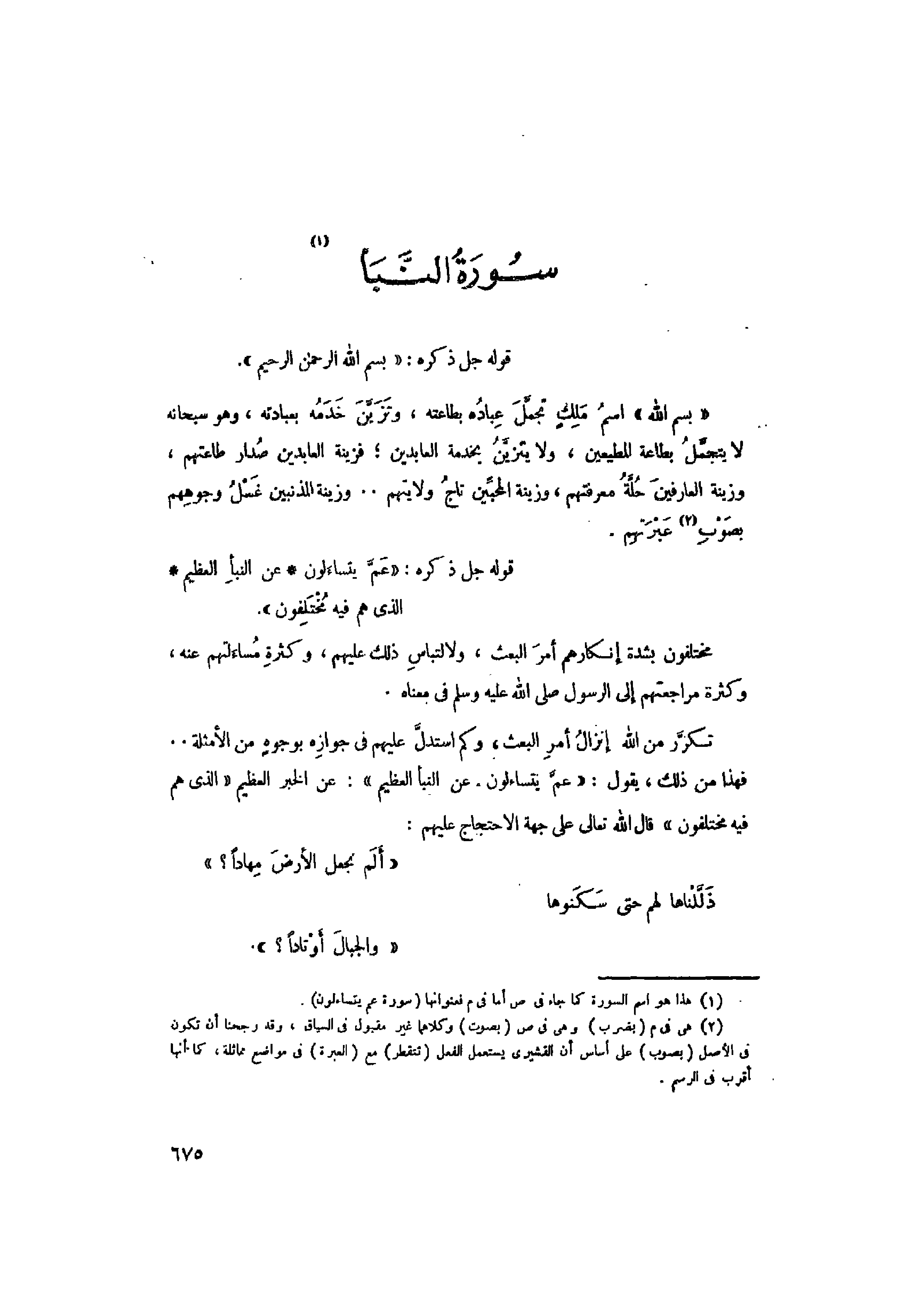 (1) هذا هو اسم السورة كما جاء في ص أما في م فعنوانها (سورة عم يتساءلون) .