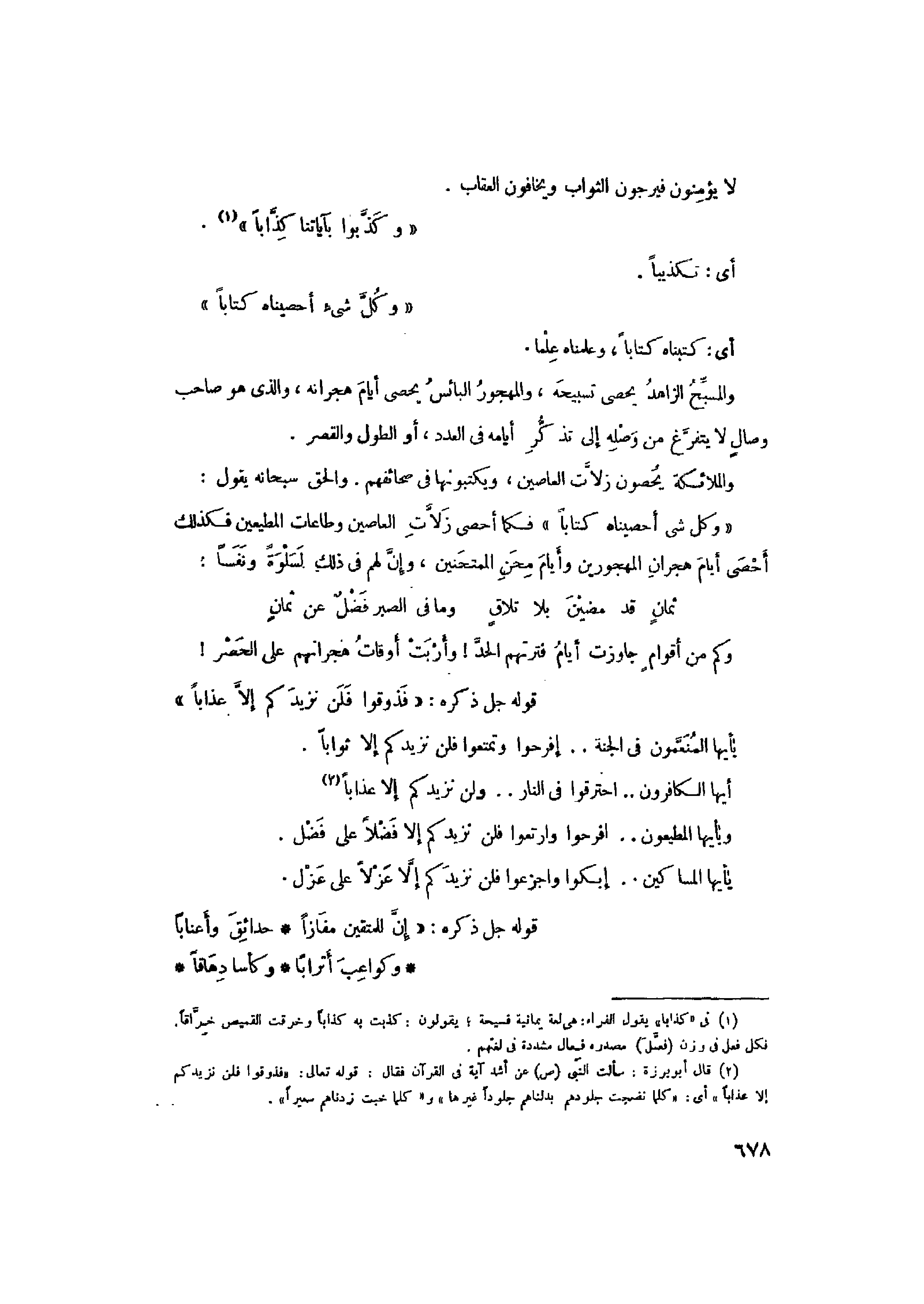 (1) فى «كِذَّاباً» يقول الفراء: هى لعة يمانية فسيحة يقولون: كذبت به كذابا وخرقت القميص خرّاقا.