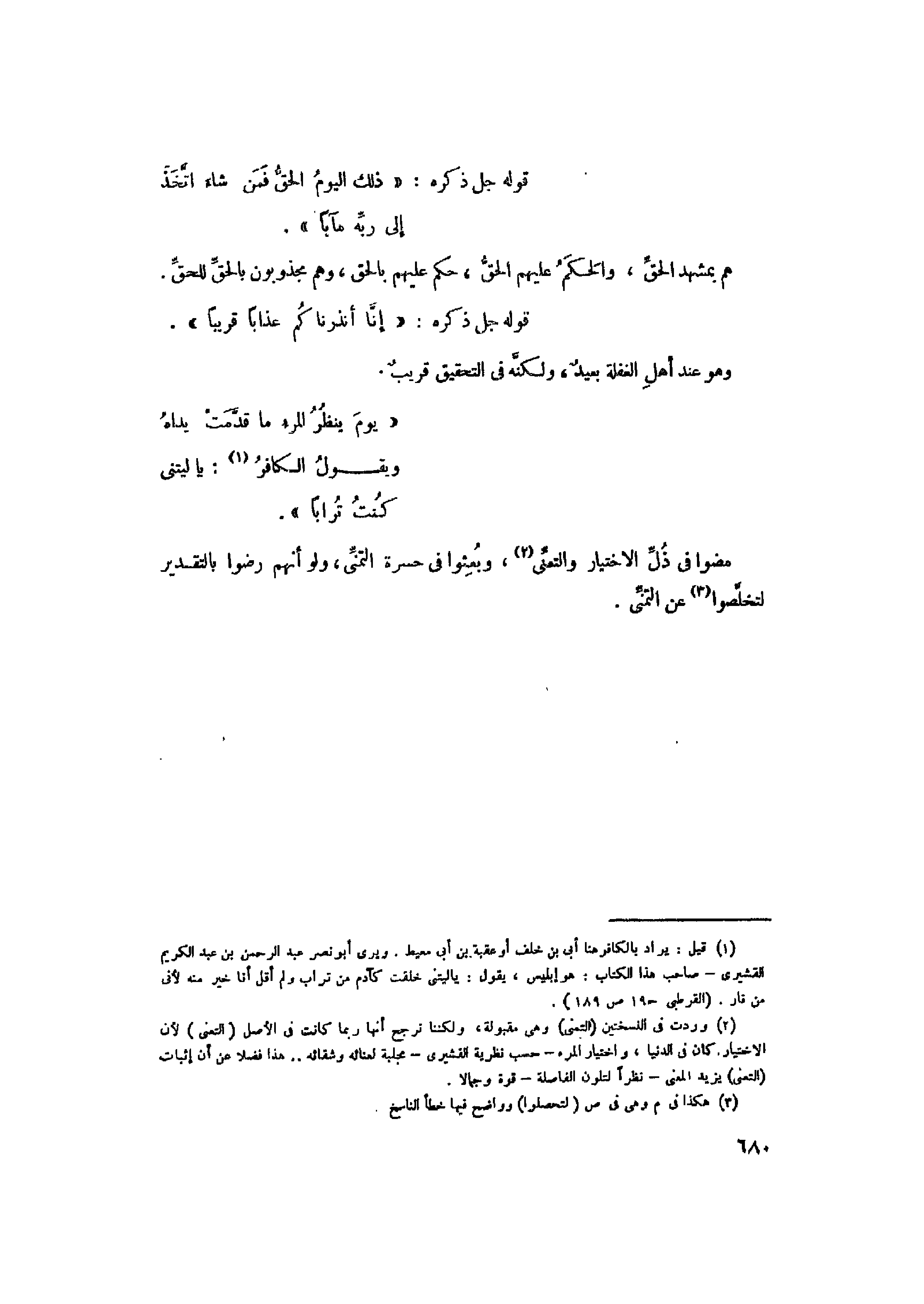 (2) وردت في النسختين (التمني) وهي مقبولة، ولكننا نرجح أنها ربما كانت في الأصل (التعنى) لأن الاختيار. كان في الدنيا، واختيار المرء- حسب نظرية القشيري- مجلبة لعنائه وشقائه.. هذا فضلا عن أن إثبات (التعنى) يزيد المعنى- نظرا لتلون الفاصلة- قوة وجمالا.