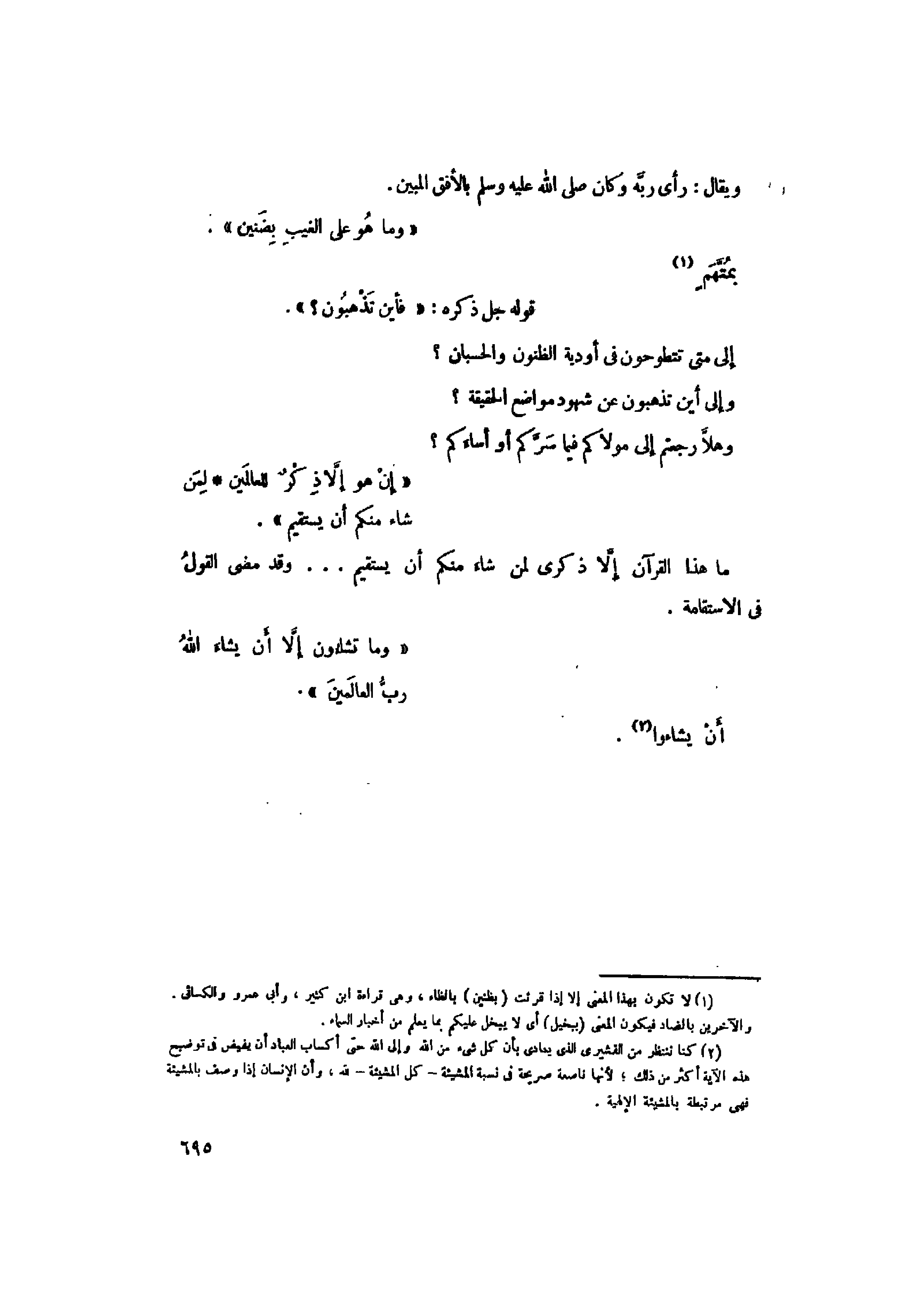 (2) كنا ننتظر من القشيري الذي ينادى بأن كل شىء من الله وإلى الله حتى أكساب العباد أن يفيض في توضيح هذه الآية أكثر من ذلك لأنها ناصعة صريحة في نسبة المشيئة- كل المشيئة- لله، وأن الإنسان إذا وصف بالمشيئة فهى مرتبطة بالمشيئة الإلهية.
