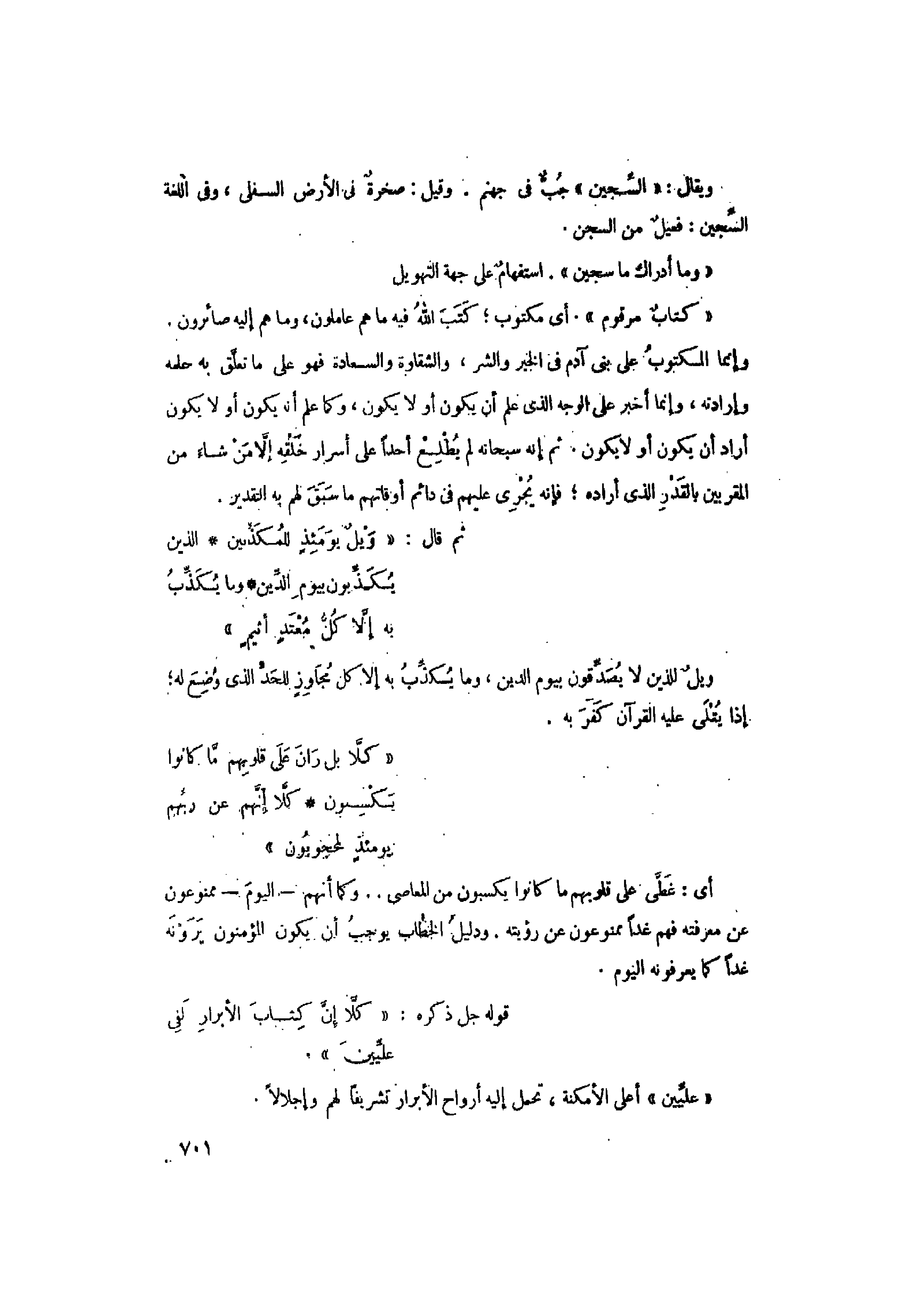 ويقال: «السّجين» جبّ في جهنم. وقيل: صخرة في الأرض السفلى، وفي اللغة السّجين: فعيل من السجن.