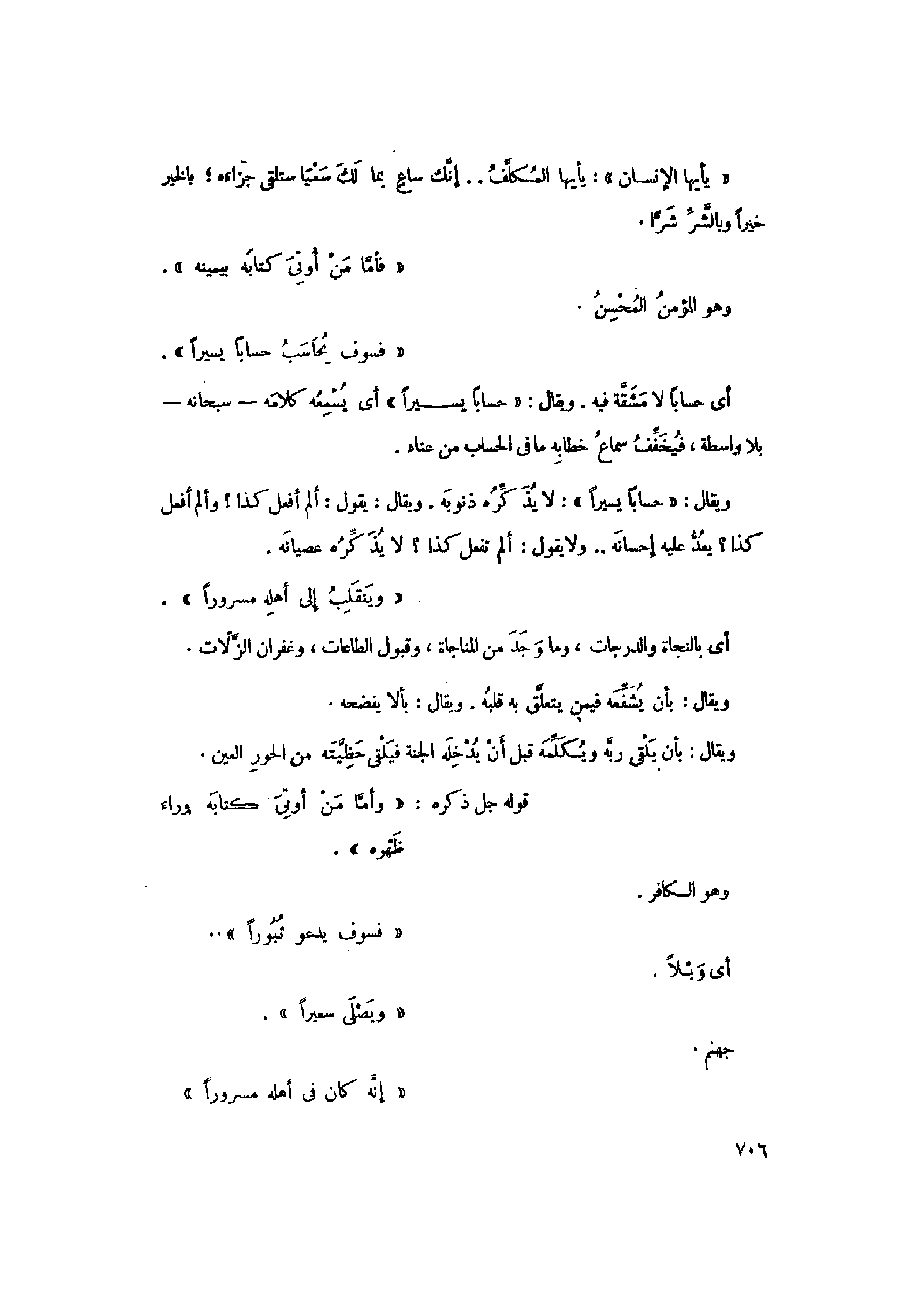 ويقال: «حِساباً يَسِيراً» : لا يذكّره ذنوبه. ويقال: يقول: ألم أفعل كذا؟ وألم أفعل كذا؟ يعدّ عليه إحسانه.. ولا يقول: ألم تفعل كذا؟ لا يذكّره عصيانه.