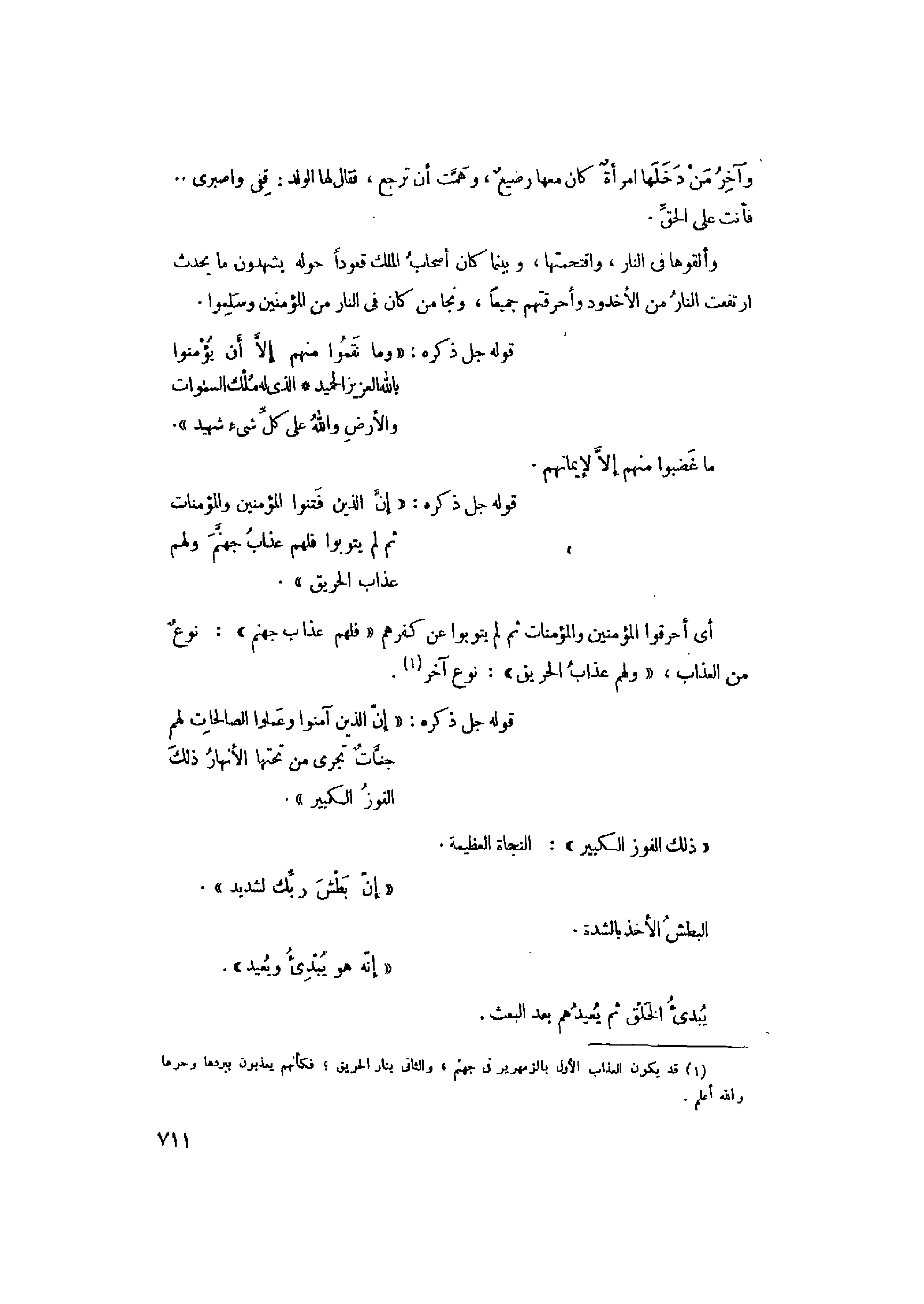قوله جل ذكره: «إِنَّ الَّذِينَ فَتَنُوا الْمُؤْمِنِينَ وَالْمُؤْمِناتِ ثُمَّ لَمْ يَتُوبُوا فَلَهُمْ عَذابُ جَهَنَّمَ وَلَهُمْ عَذابُ الْحَرِيقِ» أي أحرقوا المؤمنين والمؤمنات ثم لم يتوبوا عن كفرهم «فَلَهُمْ عَذابُ جَهَنَّمَ» : نوع من العذاب، «وَلَهُمْ عَذابُ الْحَرِيقِ» : نوع آخر «1» .