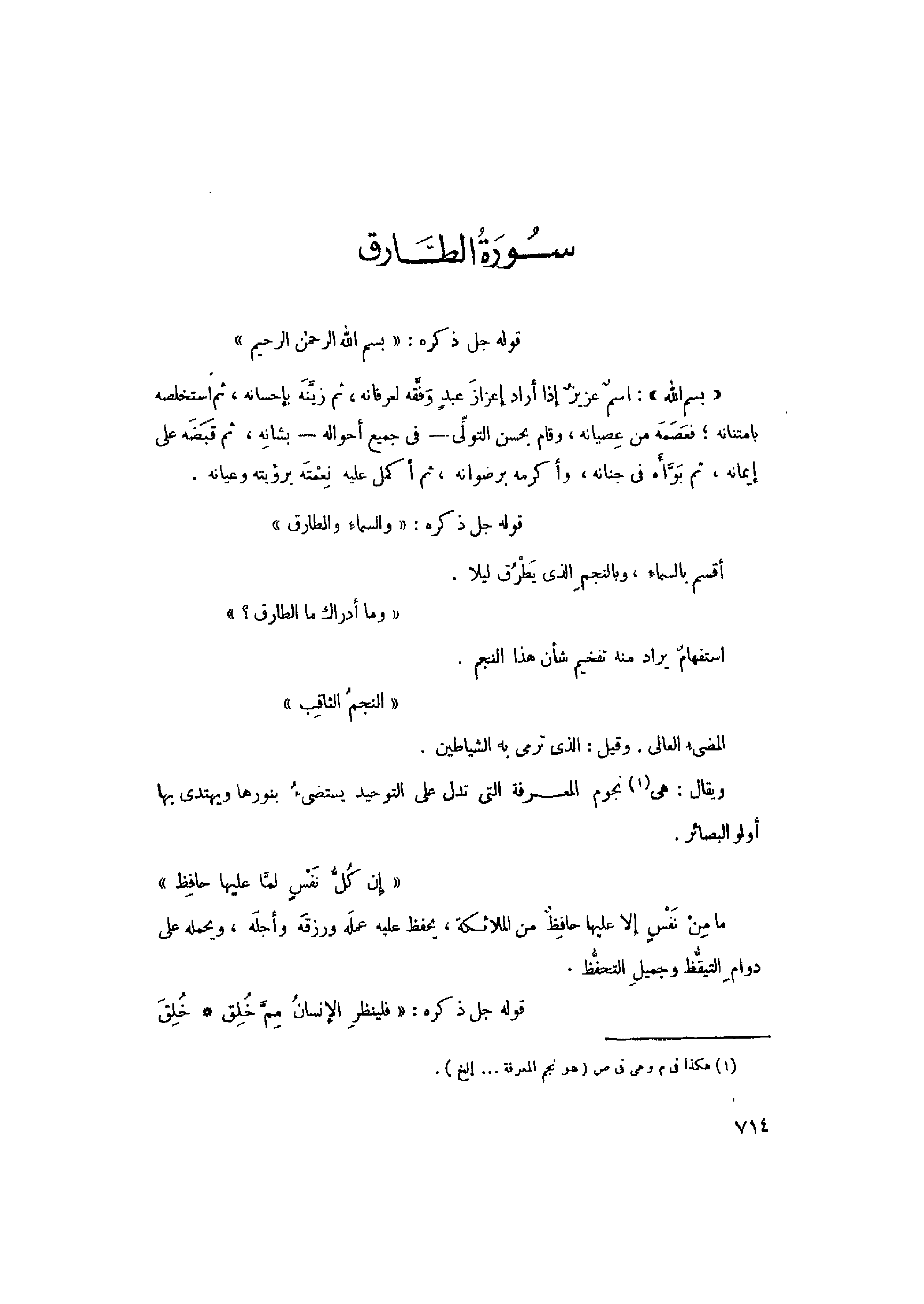 وَالسَّماءِ وَالطَّارِقِ (1) وَما أَدْراكَ مَا الطَّارِقُ (2) النَّجْمُ الثَّاقِبُ (3) إِنْ كُلُّ نَفْسٍ لَمَّا عَلَيْها حافِظٌ (4)
