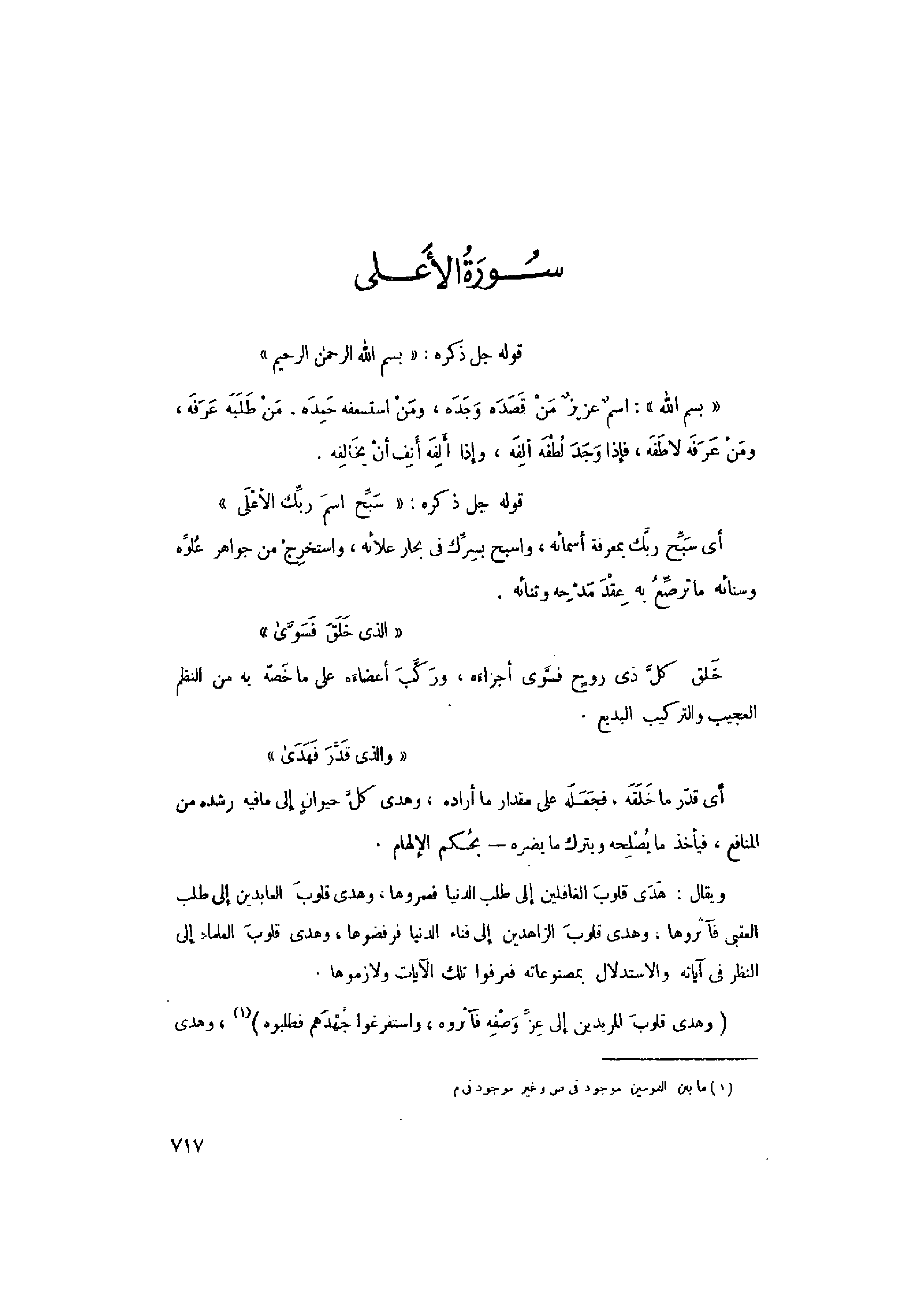 سَبِّحِ اسْمَ رَبِّكَ الْأَعْلَى (1) الَّذِي خَلَقَ فَسَوَّى (2) وَالَّذِي قَدَّرَ فَهَدى (3) وَالَّذِي أَخْرَجَ الْمَرْعى (4)
