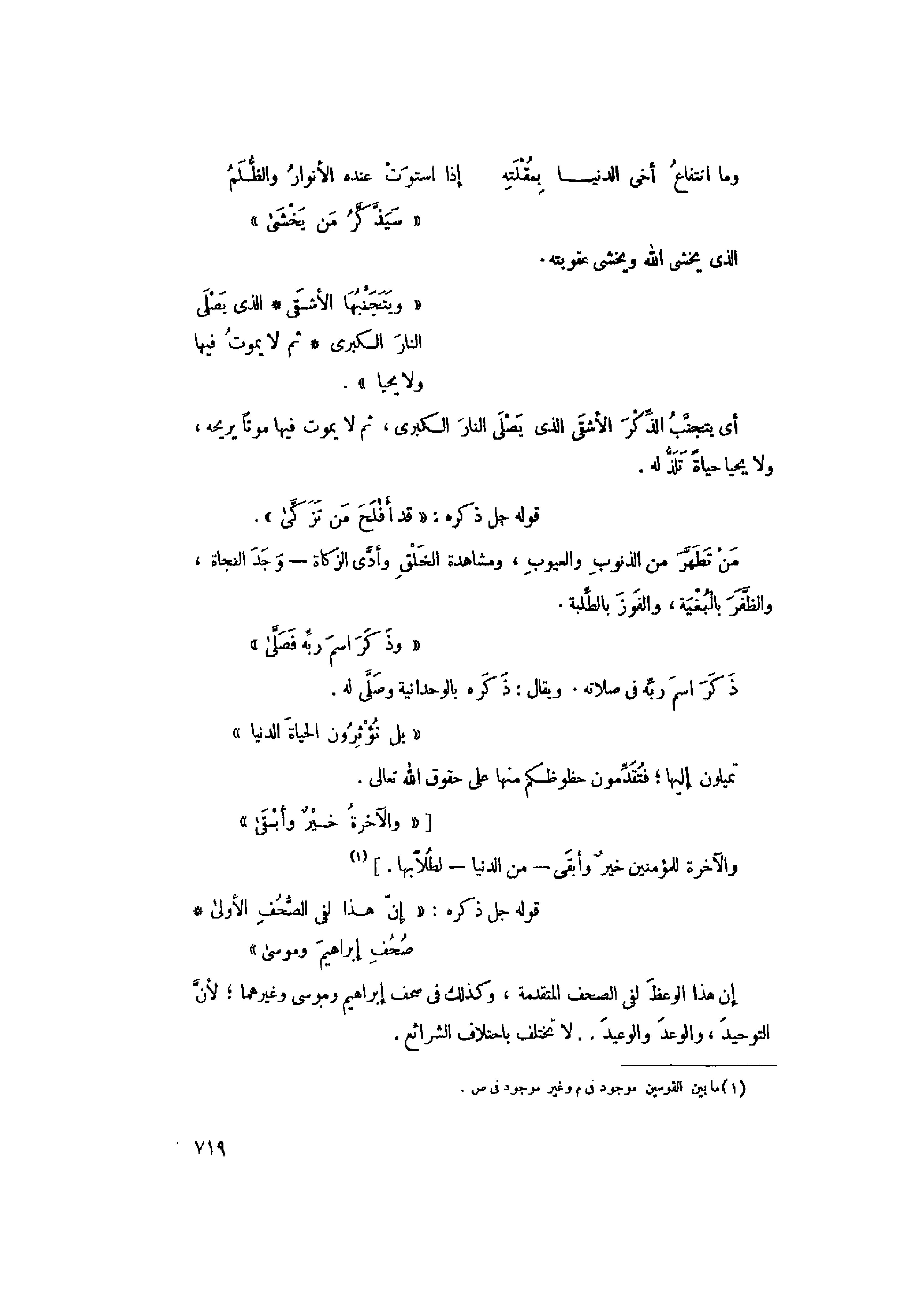 قوله جل ذكره: «إِنَّ هذا لَفِي الصُّحُفِ الْأُولى صُحُفِ إِبْراهِيمَ وَمُوسى» إن هذا الوعظ لفى الصحف المتقدمة، وكذلك في صحف إبراهيم وموسى وغيرهما لأنّ التوحيد، والوعد والوعيد.. لا تختلف باختلاف الشرائع.