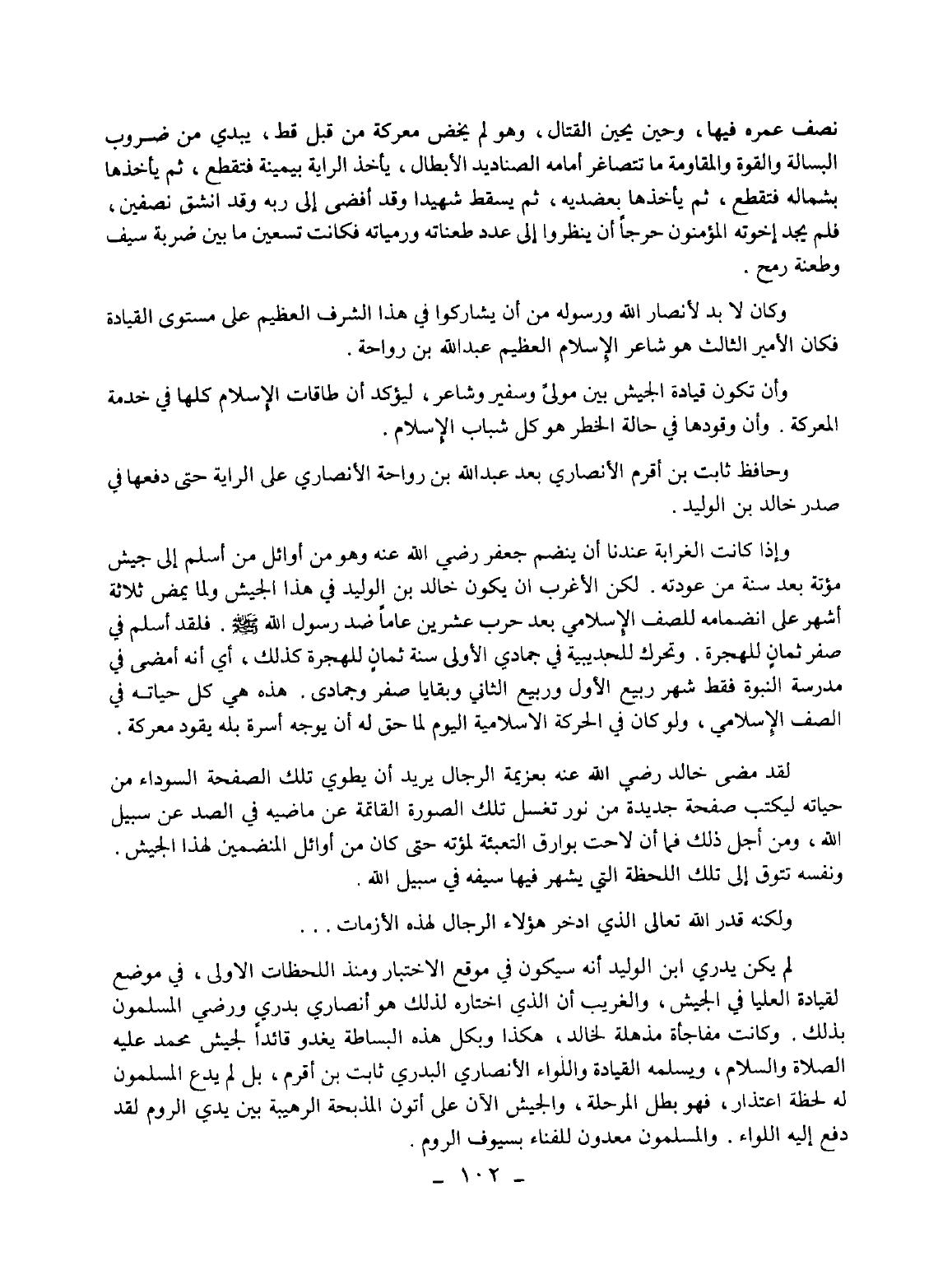 نصف عمره فيها، وحين يحين القتال، وهو لم يخض معركة من قبل قط، يبدي من ضروب البسالة والقوة والمقاومة ما تتصاغر أمامه الصناديد الأبطال، يأخذ الراية بيمينة فتقطع، ثم يأخذها بشمال فتقطع، ثم يأخذها بعضديه، ثم يسقط شهيدا وقد أفضى إلى ربه وقد انشق نصفين، فلم يجد إخوته المؤمنون حرجا أن ينظروا إلى عدد طعناته ورمياته فكانت تسعين ما بين ضربة سيف وطعنة رمح.
