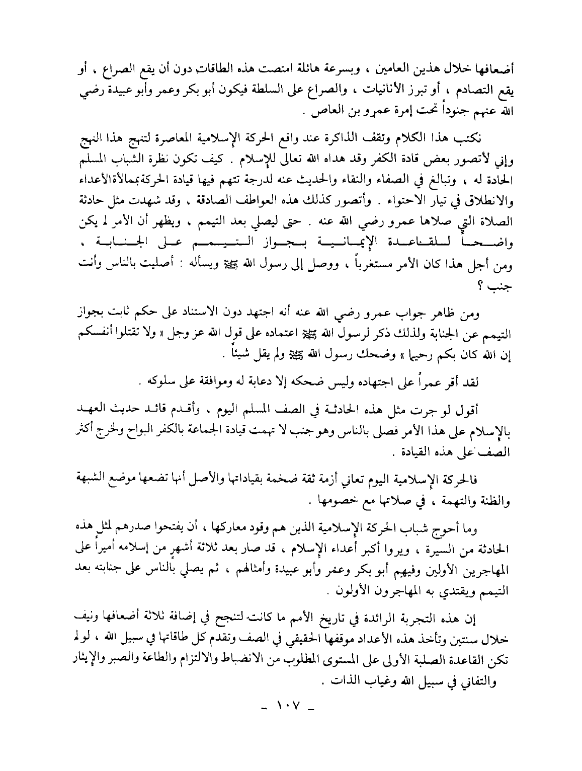 نكتب هذا الكلام وتقف الذاكرة عند واقع الحركة الإسلامية المعاصرة لتنهج هذا النهج وإني لأتصور بعض قادة الكفر وقد هداه الله تعالى للإسلام. كيف تكون نظرة الشباب المسلم الحادة له، وتبالغ في الصفاء والنقاء والحديث عنه لدرجة تتهم فيها قيادة الحركة بممالأة الأعداء والانطلاق في تيار الاحتواء. وأتصور كذلك هذه العواطف الصادقة، وقد شهدت مثل حادثة الصلاة التي صلاها عمرو رضي الله عنه. حتى ليصلي بعد التيمم، ويظهر أن الأمر لم يكن واضحا للقاعدة الإيمانية بجواز التيمم على الجنابة، ومن أجل هذا كان الأمر مستغربا، ووصل إلى رسول الله - صلى الله عليه وسلم - ويسأله: أصليت بالناس وأنت جنب؟