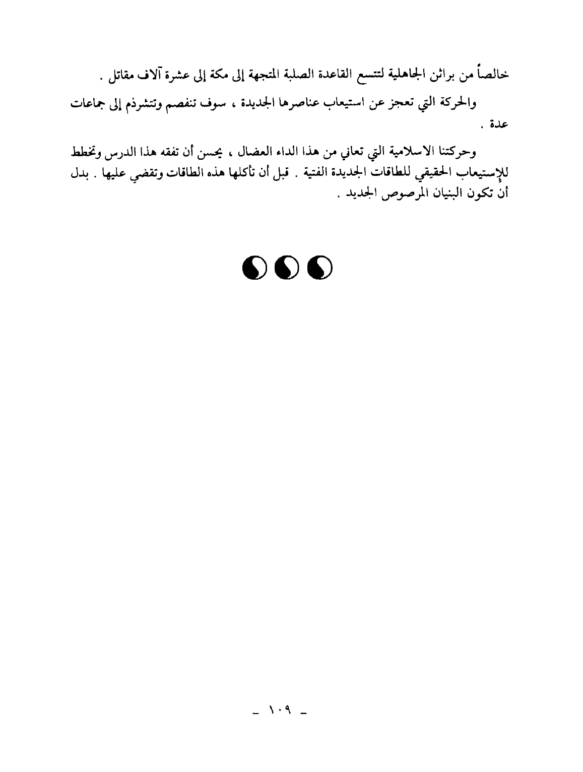وحركتنا الإسلامية التي تعاني من هذا الداء العضال، يحسن أن تفقه هذا الدرس وتخطط للاستيعاب الحقيقي للطاقات الجديدة الفتية. قبل أن تأكلها هذه الطاقات وتقضي عليها. بدل أن تكون البنيان المرصوص الجديد.