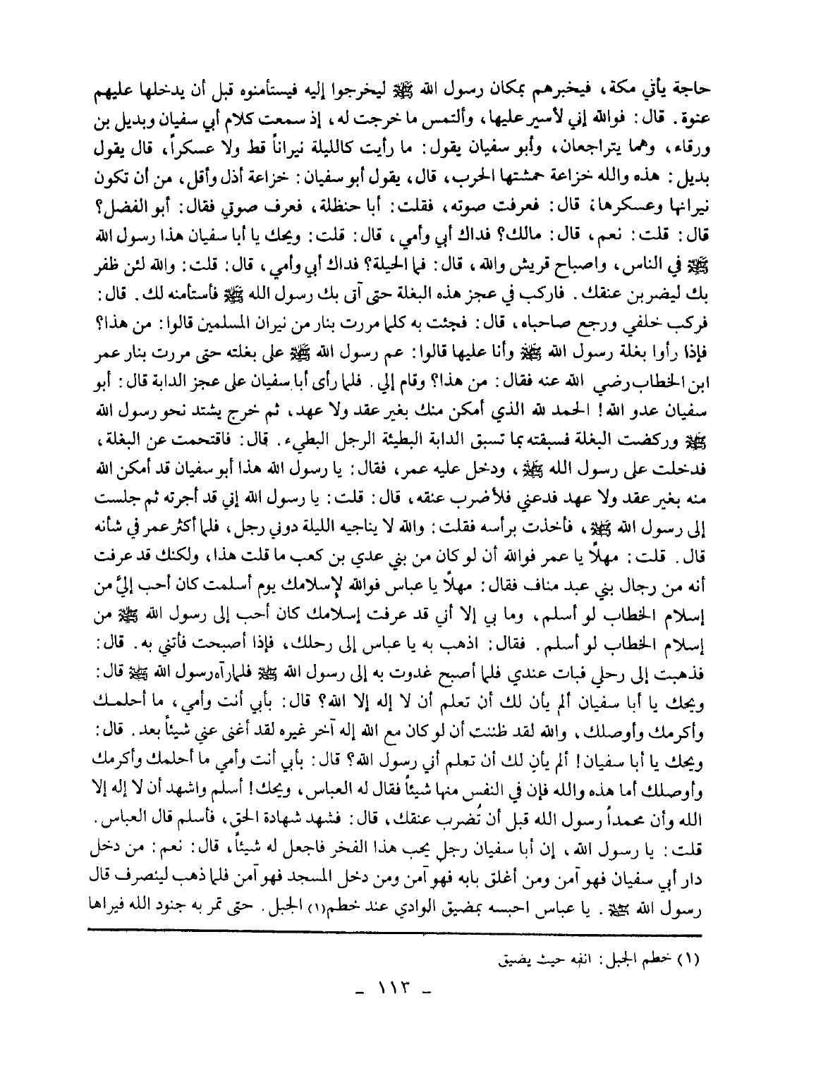 حاجة يأتي مكة، فيخبرهم بمكان رسول الله - صلى الله عليه وسلم - ليخرجوا إليه فيستأمنوه قبل أن يدخلها عليهم عنوة. قال: فوالله إني لأسير عليها، وألتمس ما خرجت له، إذ سمعت كلام أبي سفيان وبديل بن ورقاء، وهما يتراجعان، وأبو سفيان يقول: ما رأيت كالليلة نيرانا قط ولا عسكرا، قال يقول بديل: هذه والله خزاعة حمشتها الحرب، قال، يقول أبو سفيان: خزاعة أذل وأقل، من أن تكون نيرابها وعسكرها، قال: فعرفت صوته، فقلت: أبا حنظلة، فعرف صوتي فقال: أبو الفضل؟ قال: قلت: نعم، قال: ما لك؟ فداك أبي وأمي، قال: قلت: ويحك يا أبا سفيان هذا رسول الله - صلى الله عليه وسلم - في الناس، واصباح قريش والله، قال: فما الحيلة؟ فداك أبي وأمي، قال: قلت: والله لئن ظفر بك ليضربن عنقك. فاركب في عجز هذه البغلة حتى آتي بك رسول الله - صلى الله عليه وسلم - فأستأمنه لك. قال: فركب خلفي ورجع صاحباه، قال: فجئت به كلما مررت بنار من نيران المسلمين قالوا: من هذا؟ فإذا رأوا بغلة رسول الله - صلى الله عليه وسلم - وأنا عليها قالوا: عم رسول الله - صلى الله عليه وسلم - على بغلته حتى مررت بنار عمر ابن الخطاب رضي الله عنه فقال: من هذا؟ وقام إلي. فلما رأى أبا سفيان على عجز الدابة قال: أبو سفيان عدو الله! الحمد لله الذي أمكن منك بغير عقد ولا عهد، ثم خرج يشتد نحو رسول الله - صلى الله عليه وسلم - وركضت البغلة فسبقته بما تسبق الدابة البطيئة الرجل البطيء. قال: فاقتحمت عن البغلة، فدخلت على رسول الله - صلى الله عليه وسلم -، ودخل عليه عمر، فقال: يا رسول الله هذا أبو سفيان قد أمكن الله منه بغير عقد ولا عهد فدعني فلأضرب عنقه، قال: قلت: يا رسول الله إني قد أجرته ثم جلست إلى رسول الله - صلى الله عليه وسلم -، فأخذت برأسه فقلت: والله لا يناجيه الليلة دوني رجل، فلما أكثر عمر في شأنه قال. قلت: مهلا يا عمر فوالله أن لو كان من بني عدي بن كعب ما قلت هذا، ولكنك قد عرفت أنه من رجال بني عبد ضمناف فقال: مهلا يا عباس فوالله لإسلامك يوم أسلمت كان أحب إلي من إسلام الخطاب لو أسلم، وما بي إلا أني قد عرفت إسلامك كان أحب إلى رسول الله - صلى الله عليه وسلم - من إسلام الخطاب لو أسلم. فقال: اذهب به يا عباس إلى رحلك، فإذا أصبحت فأتني به. قال: فذهبت إلى رحلي فبات عندي فلما أصبح غدوت به إلى رسول الله - صلى الله عليه وسلم - فلما رآه رسول الله - صلى الله عليه وسلم - قال: ويحك يا أبا سفيان ألم يأن لك أن تعلم أن لا إله إلا الله؟ قال: بأبي أنت وأمي، ما أحلمك وأكرمك وأوصلك، والله لقد ظننت أن لو كان مع الله إله آخر غيره لقد أغنى عني شيئا بعد. قال: ويحك يا أبا سفيان! ألم يأني لك أن تعلم أني رسول الله؟ قال: بأبي أنت وأمي ما أحلمك وأكرمك وأوصلك أما هذه والله فإن في النفس منها شيئا فقال له العباس، ويحك! أسلم واشهد أن لا إله إلا الله وأن محمدا رسول الله قبل أن تضرب عنقك، قال: فشهد ثهادة الحق، فأسلم قال العباس. قلت: يا رسول الله، إن أبا سفيان رجل يحب هذا الفخر فاجعل له شيئا، قال: نعم: من دخل دار أبي سفيان فهو آمن ومن أغلق بابه فهو آمن ومن دخل المسجد فهو آمن فلما ذهب لينصرف قال رسول الله - صلى الله عليه وسلم -: يا عباس احبسه بمضيق الوادي عند خطم (¬1) الجبل. حتى تمر به جنود الله فيراها