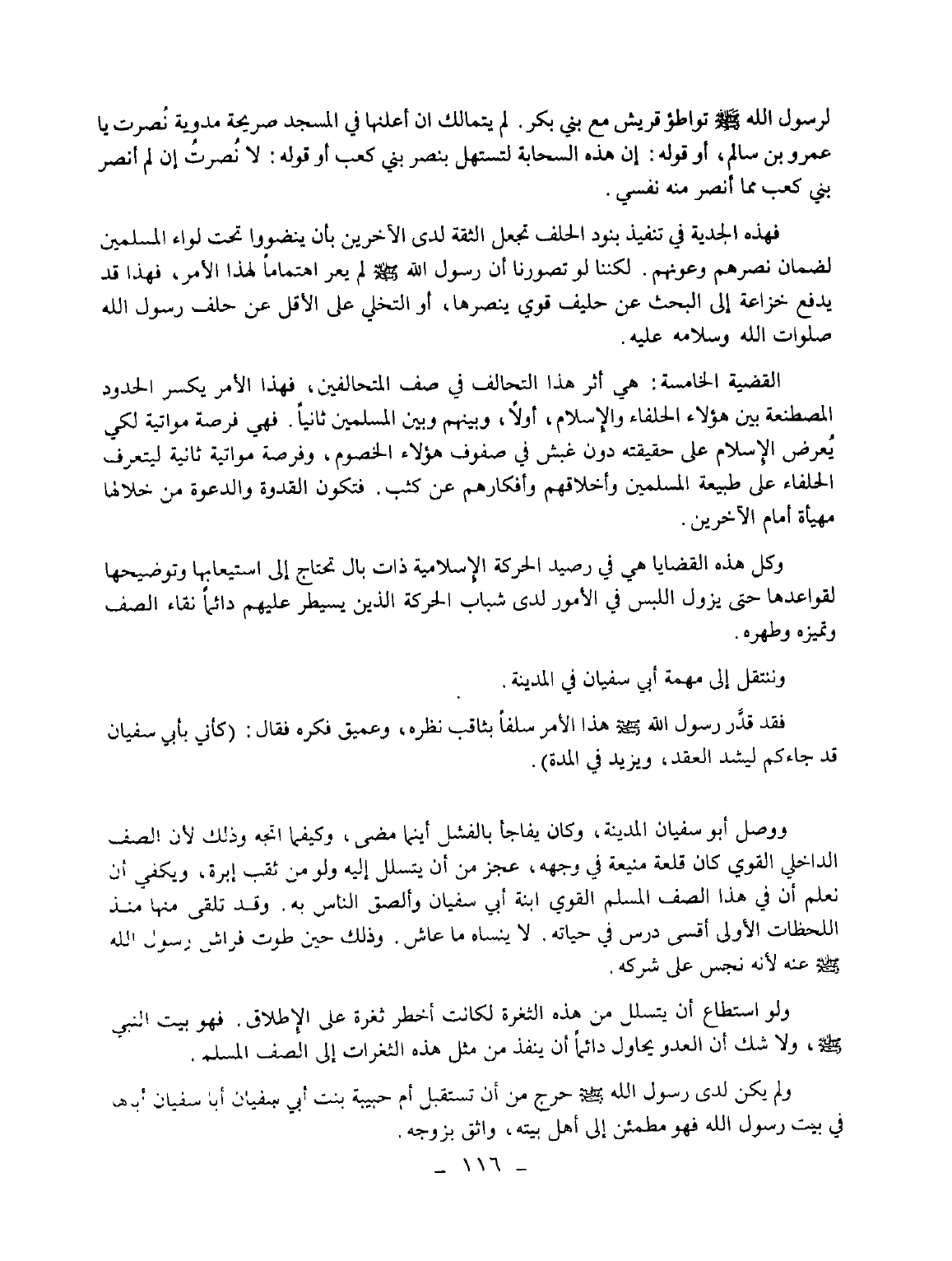 ووصل أبو سفيان المدينة، وكان يفاجأ بالفشل أينما مضى، وكيفما اتجه وذلك لأن الصف الداخلي القوي كان قلعة منيعة في وجهه، عجز من أن يتسلل إليه ولو من ثقب إبرة، ويكفي أن نعلم أن في هذا الصف المسلم القوي ابنة أبي سفيان وألصق الناس به. وقد تلقى منها منذ اللحظات الأولى أقسى درس في حياته. لا ينساه ما عاش. وذلك حين طوت فراش رسول الله - صلى الله عليه وسلم - عنه لأنه نجس على شركه.