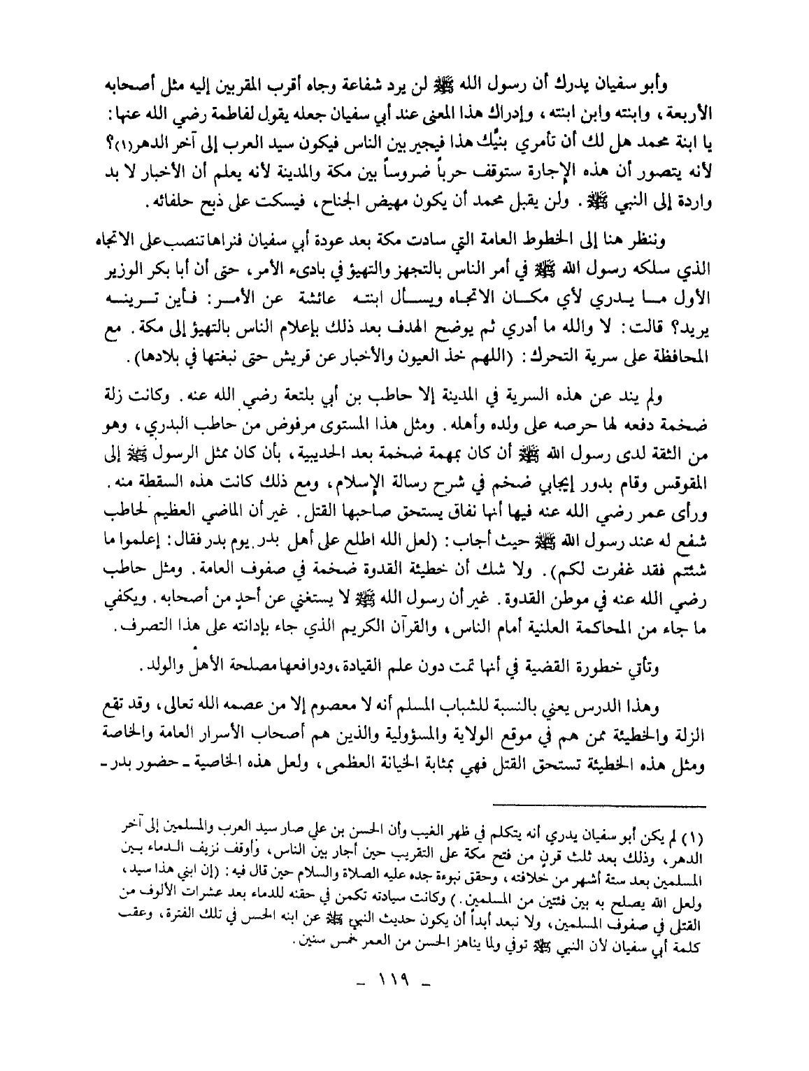 (¬1) لم يكن أبو سفيان يدري أنه يتكلم في ظهر الغيب وأن الحسن بن علي صار سيد العرب والمسلمين إلى آخر الدهر، وذلك بعد ثلث قرن من فتح مكة على التقريب حين أجار بين الناس، وأوقف نزيف الدماء بين المسلمين بعد ستة أشهر من خلافته، وحقق نبوءة جده عليه الصلاة والسلام حين قال فيه: (إن ابني هذا سيد، ولعل الله يصلح به بين فئتين من المسلمين.) وكانت سيادته تكمن في حقنه للدماء بعد عشرات الألوف من القتلى في صفوف المسلمين، ولا نبعد أبدا أن يكون حديث النبي - صلى الله عليه وسلم - عن ابنه الحسن في تلك الفترة، وعقب كلمة أبي سفيان لأن النبي - صلى الله عليه وسلم - توفي ولما يناهز الحسن من العمر خمس سنين.