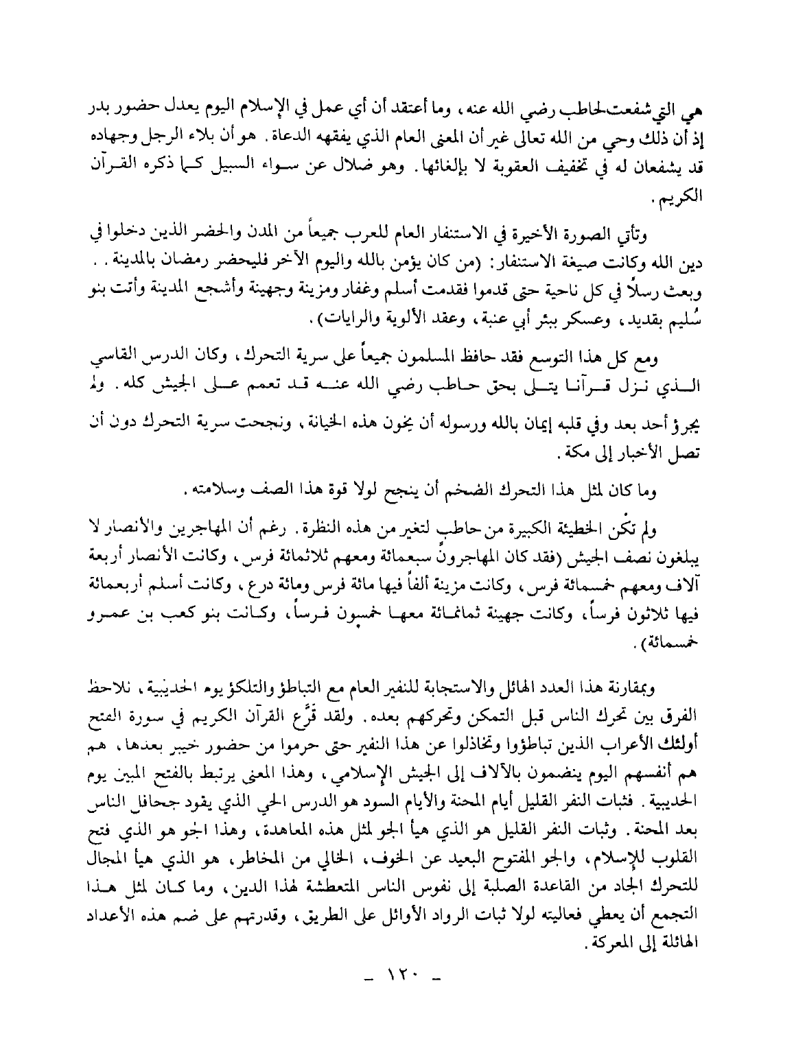 هي التي شفعت لحاطب رضي الله عنه، وما أعتقد أن أي عمل في الإسلام اليوم يعدل حضور بدر إذ أن ذلك وحي من الله تعالى غير أن المعنى العام الذي يفقهه الدعاة، هو أن بلاء الرجل وجهاده قد يشفعان له في تخفيف العقوبة لا بإلغائها. وهو ضلال عن سواء السبيل كما ذكره القرآن الكريم.