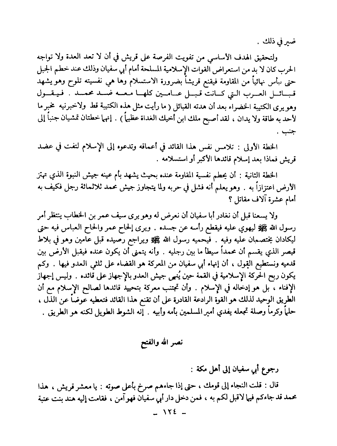 ولا يسعنا قبل أن نغادر أبا سفيان أن نعرض له وهو يرى سيف عمر بن الخطاب ينتظر أمر رسول الله - صلى الله عليه وسلم - ليهوي عليه فيقطع رأسه عن جسده. ويرى إلحاح عمر وإلحاح العباس فيه حتى ليكادان يختصمان عليه وفيه. فيحميه رسول الله - صلى الله عليه وسلم - ويراجع رصيده قبل عامين وهو في بلاط قيصر الذي يقسم أن محمدا سيطأ ما بين رجليه. وأنه يتمنى أن يكون عنده فيقبل الأرض بين قدميه ونستطيع القول، أن إنهاء أبي سفيان من المعركة هو القضاء على ثلثي العدو فيها. وكم يكون ربح الحركة الإسلامية في القمة حين ينهى جيش العدو بالإجهاز على قائده. وليس إجهاز الإفناء، بل هو إدخاله في الإسلام. وأن تجتنب معركة بتحييد قائدها لصالح الإسلام مع أن الطريق الوحيد لذلك هو القوة الرادعة القادرة على أن تقنع هذا القائد فتعطيه عوضا عن الذل، حلما وكرما وصلة تجعله يفدي أمير المسلمين بأمه وأبيه. إنه الشرط الطويل لكنه هو الطريق.