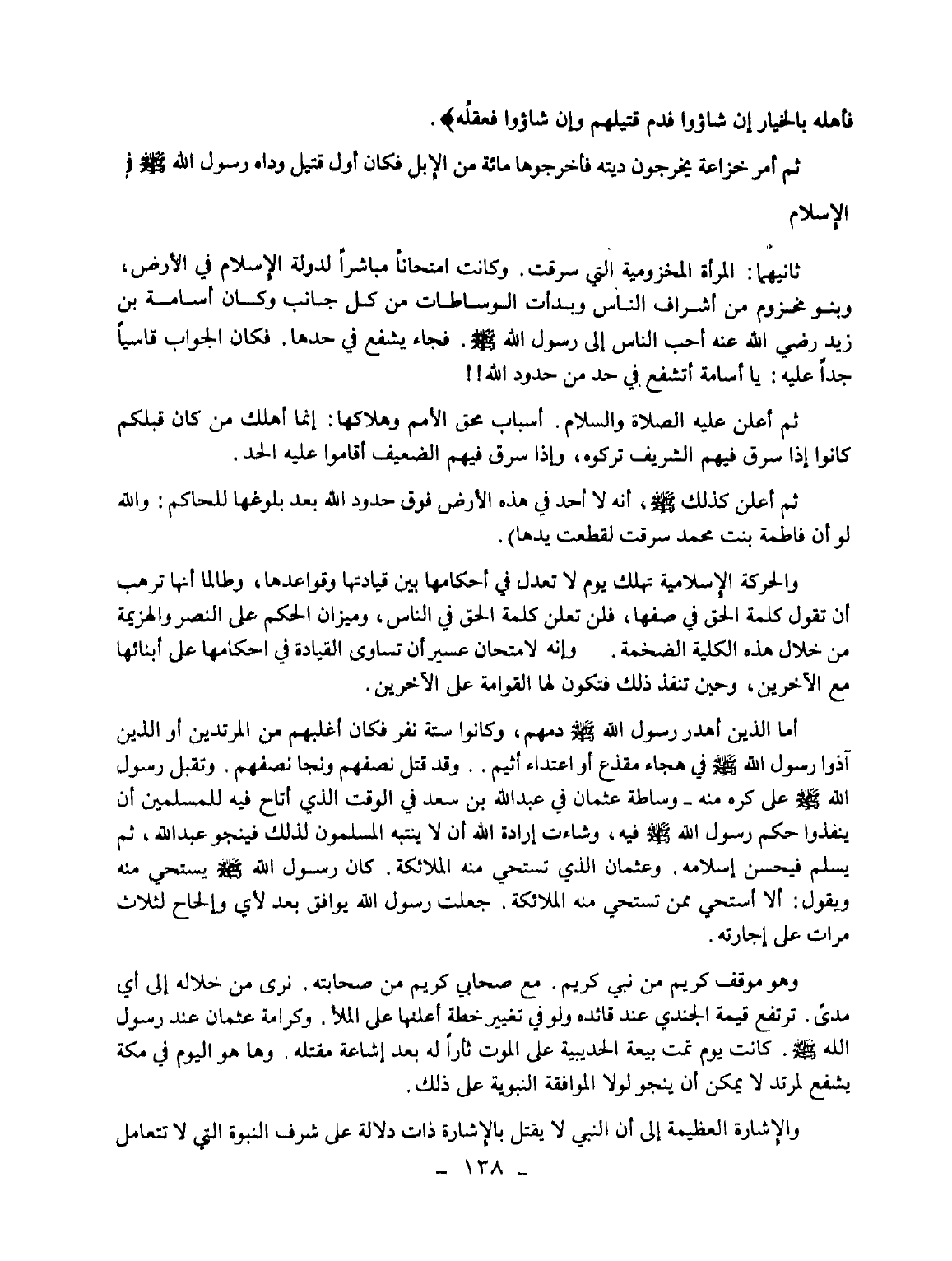 ثانيهما: المرأة المخزومية التي سرقت. وكانت امتحانا مباشرا لدولة الإسلام في الأرض، وبنو مخزوم من أشراف الناس وبدأت الوساطات من كل جانب وكان أسامة بن زيد رضي الله عنه أحب الناس إلى رسول الله - صلى الله عليه وسلم -. فجاء يشفع في حدها، فكان الجواب قاسيا جدا عليه: يا أسامة أتشفع في حد من حدود الله!!