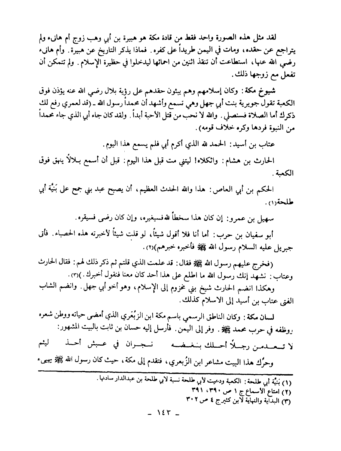 لقد مثل هذه الصورة واحد فقط من قادة مكة هو هبيرة بن أبي وهب زوج أم هانىء ولم يتراجع عن حقده، ومات في اليمن طريدا على كفره. فماذا يذكر التاريخ عن هبيرة. وأم هانىء رضي الله عنها، استطاعت أن تنقذ اثنين من أحمائها ليدخلوا في حظيرة الإسلام. ولم تتمكن أن تفعل مع زوجها ذلك.
