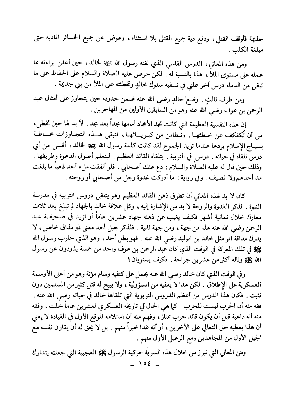 إن هذه النفسية العظيمة التى كانت تجد الأمجاد أمامها مجدا بعد مجد. لا بد لها حين تخطىء من أن تكفكف عن خطئها. وتطامن من كبريائها، فتبقى هذه التجاوزات محاطة بسياج الإسلام يردها عندما تريد الجموح لقد كانت كلمة رسول الله - صلى الله عليه وسلم - لخالد، أقسى من أي درس تلقاه في حياته. درس في التربية، يتلقاه القائد العظيم، ليتعلم أصول الدعوة وطريقها. وذلك حين قال له عليه الصلاة والسلام: دع عنك أصحابي. فلو أنفقت ملء أحد ذهبا ما بلغت مد أحدهم ولا نصيفه. وفي رواية: ما أدركت غدوة رجل من أصحابي أو روحته.