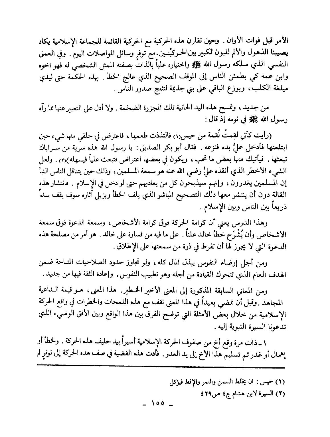 الأمر قبل فوات الأوان. وحين تقارن هذه الحركية مع الحركية القائمة للجماعة الإسلامية يكاد يصيبنا الذهول والألم للبون الكبير بين الحركتين. مع توفر وسائل المواصلات اليوم. وفي العمق النفسي الذي سلكه رسول الله - صلى الله عليه وسلم - واختياره عليا بالذات بصفته الممثل الشخصي له فهو أخوه وابن عمه كي يطمئن الناس إلى الموقف الصحيح الذي عالج الخطأ. بهذه الحكمة حتى ليدي مبلغة الكلب، ويوزع الباقي على بني جذيمة لتثلح صدور الناس.