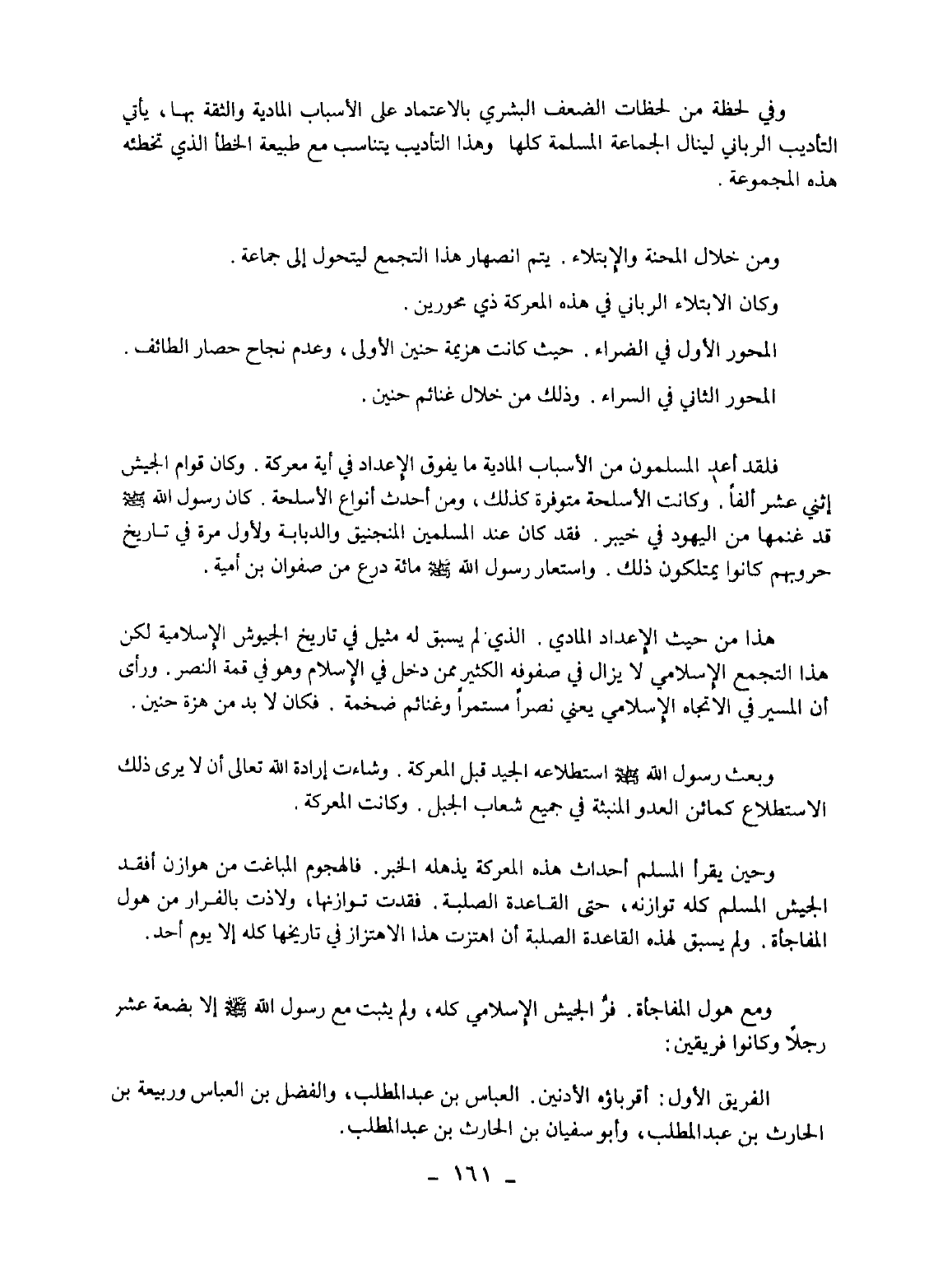 وحين يقرأ المسلم أحداث هذه المعركة يذهله الخبر. فالهجوم المباغت من هوازن أفقد الجيش المسلم كله توازنه، حتى القاعدة الصلبة. فقدت توازنها، ولاذت بالفرار من هول المفاجأة. ولم يسبق لهذه القاعدة الصلبة أن اهتزت هذا الاهتزاز في تاريخها كله إلا يوم أحد.