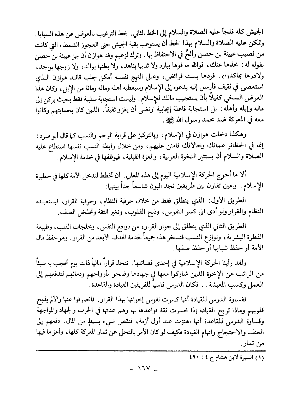 وهكذا دخلت هوازن في الإسلام، وبالتركيز على قرابة الرحم والنسب كما قال أبو صرد: إنما في الحظائر عماتك وخالاتك فامنن عليهم، ومن خلال رابطة النسب نفسها استطاع عليه الصلاة والسلام أن يستثير النخوة العربية، والعزة القبلية، فيوظفها في خدمة الإسلام.