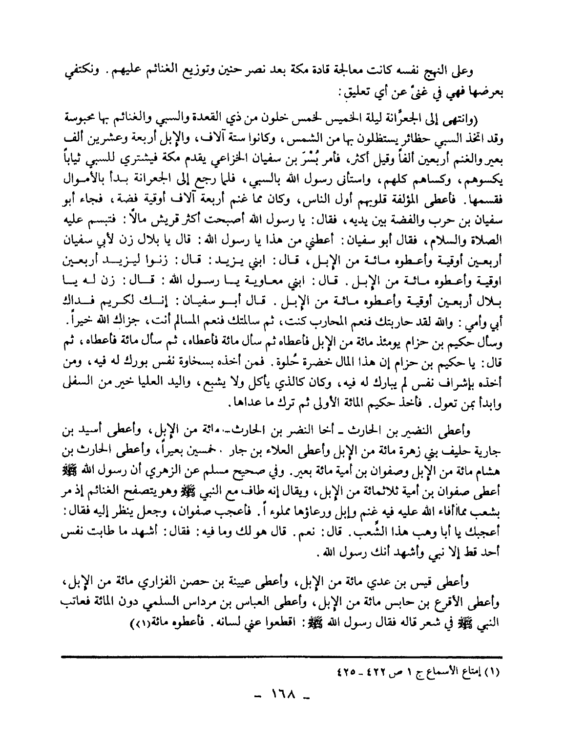 (وانتهى إلى الجعرانة ليلة الخميس لخمس خلون من ذي القعدة والسبي والغنائم بها محبوسة وقد اتخذ السبي حظائر يستظلون بها من الشمس، وكانوا ستة آلاف، والإبل أربعة وعشرين ألف بعير والغنم أربعين ألفا وقيل أكثر، فأمر بسر بن سفيان الخزاعي يقدم مكة فيشتري للسبي ثيابا يكسوهم، وكساهم كلهم، واستأنى رسول الله بالسبي، فلما رجع إلى الجعرانة بدأ بالأموال فقسمها. فأعطى المؤلفة قلوبهم أول الناس، وكان مما غنم أربعة آلاف أوقية فضة، فجاء أبو سفيان بن حرب والفضة بين يديه، فقال: يا رسول الله أصبحت أكثر قريش مالا: فتبسم عليه الصلاة والسلام، فقال أبو سفيان: أعطني من هذا يا رسول الله: قال يا بلال زن لأبي سفيان أربعين أوقية وأعطوه مائة من الإبل، قال: ابني يزيد: قال: زنوا ليزيد أربعين أوقية وأعطوه مائة من الإبل. قال: ابني معاوية يا رسول الله: قال: زن له يا بلال أربعين أوقية وأعطوه مائة من الإبل. قال أبو سفيان: إنك لكريم فداك أبي وأمي: والله لقد حاربتك فنعم المحارب كنت، ثم سالمتك فنعم المسالم أنت، جزاك الله خيرا. وسأل حكيم بن حزام يومئذ مائة من الإبل فأعطاه ثم سأل مائة فأعطاه، ثم سأل مائة فأعطاه، ثم قال: يا حكيم بن حزام إن هذا المال خضرة حلوة. فمن أخذه بسخاوة نفس بورك له فيه، ومن أخذه بإشراف نفس لم يبارك له فيه، وكان كالذي يأكل ولا يشبع، واليد العليا خير من السفلى وابدأ بمن تعول. فأخذ حكيم المائة الأولى ثم ترك ما عداها.