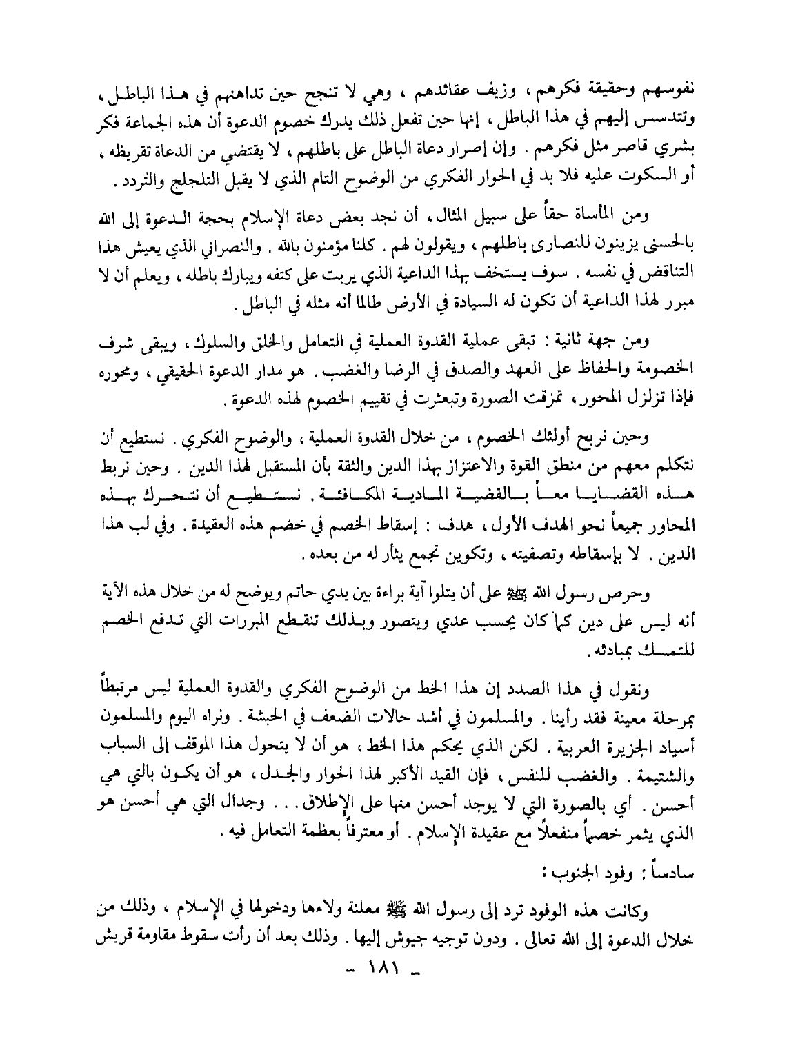 ونقول في هذا الصدد إن هذا الخط من الوضح الفكري والقدوة العملية ليس مرتبطا بمرحلة معينة فقد رأينا. والمسلمون في أشد حالات الضعف في الحبشة. ونراه اليوم والمسلمون أسياد الجزيرة العربية. لكن الذي يحكم هذا الخط، هو أن لا يتحول هذا الموقف إلى السباب والشتيمة. والغضب للنفس، فإن القيد الأكبر لهذا الحوار والجدل؛ هو أن يكون بالتي هي أحسن. أي بالصورة التي لا يوجد أحسن منها على الإطلاق ... وجدال التي هي أحسن هو الذي يثمر خصما منفعلا مع عقيدة الإسلام. أو معترفا بعظمة التعامل فيه.