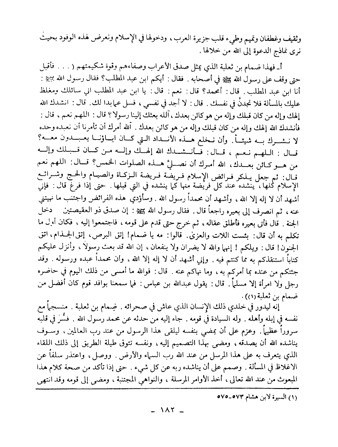 إنه ليدور في خلدي ذلك الإنسان الذي عاش في صحرائه. ضمام بن ثعلبة. منسجما مع نفسه في إبله وأهله. وله السيادة في قومه. جاء إليه من حدثه عن محمد رسول الله. فسر في قلبه سرورا عظيما. وعزم على أن يمضي بنفسه ليلقى هذا الرسول من عند رب العالين، وسوف يناشده الله أن يصدقه، ومضى بهذا التصميم إليه، ونفسه تتوق طيلة الطريق إلى ذلك اللقاء الذي يتعرف به على هذا المرسل من عند الله رب السماء والأرض. ووصل، واعتذر سلفا عن الأغلاظ في المسألة. وصمم على أن يناشده ربه عن كل شيء. حتى إذا تأكد من صحة كلام هذا المبعوث من عند الله تعالى، أخذ الأوامر المرسلة، والنواهي المجتنبة، ومضى إلى قومه وقد انتهى