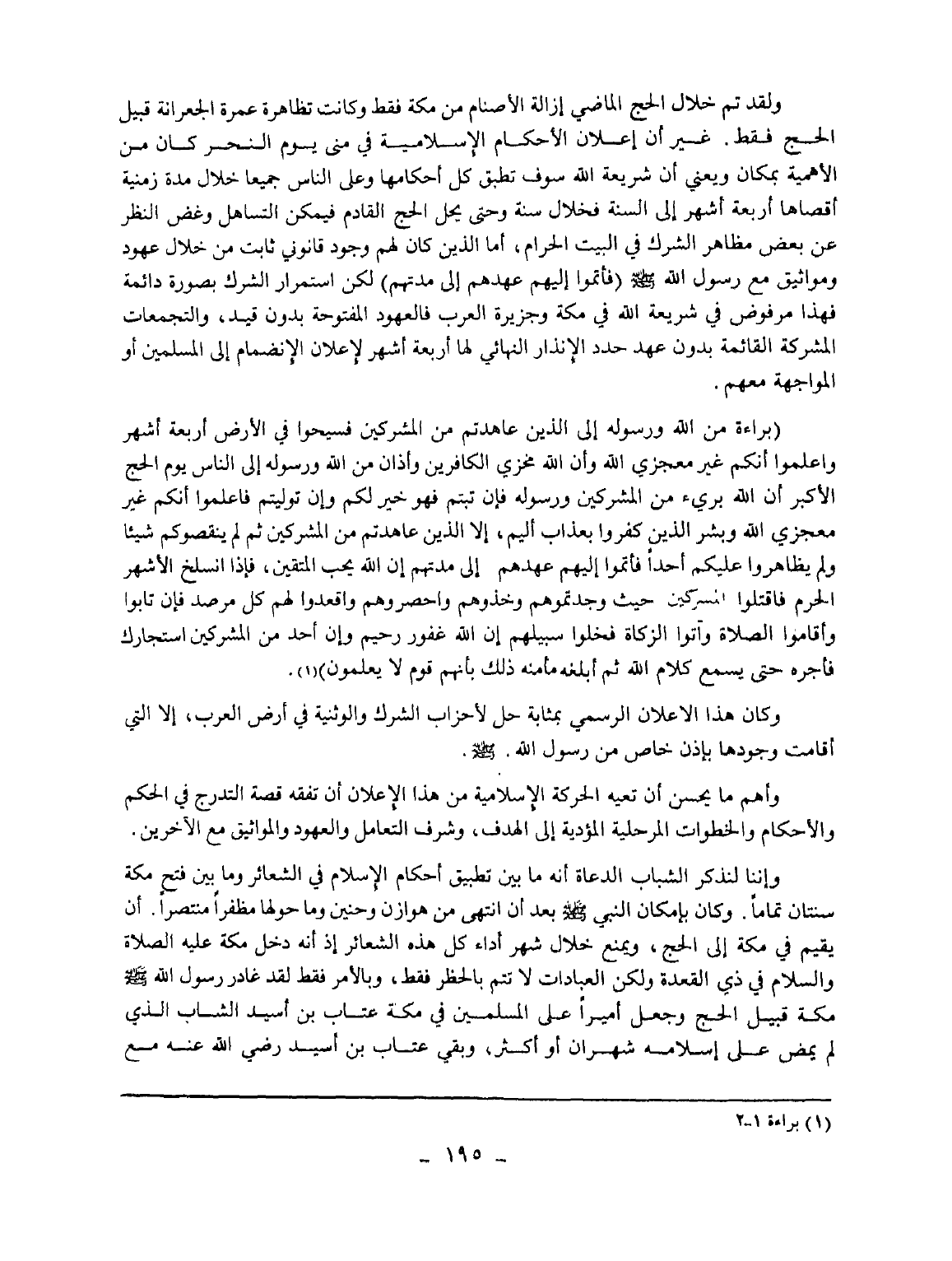 ولقد تم خلال الحج الماضي إزالة الأصنام من مكة فقط وكانت تظاهرة عمرة الجعرانة قبيل الحج فقط. غير أن إعلان الأحكام الإسلامية في منى يوم النحر كان من الأهمية بمكان ويعني أن شريعة الله سوف تطبق كل أحكامها وعلى الناس جميعا خلال مدة زمنية أقصاها أربعة أشهر إلى السنة فخلال سنة وحتى يحل الحج القادم فيمكن التساهل وغض النظر عن بعض مظاهر الشرك في البيت الحرام، أما الذين كان لهم وجود قانوني ثابت من خلال عهود ومواثيق مع رسول الله - صلى الله عليه وسلم - {فأتموا إليهم عهدهم إلى مدتهم} لكن استمرار الشرك بصورة دائمة فهذا مرفوض في شريعة الله في مكة وجزيرة العرب فالعهود المفتوحة بدون قيد، والتجمعات المشركة القائمة بدون عهد حدد الإنذار النهائي لها أربعة أشهر لإعلان الإنضمام إلى المسلمين أو المواجهة معهم.