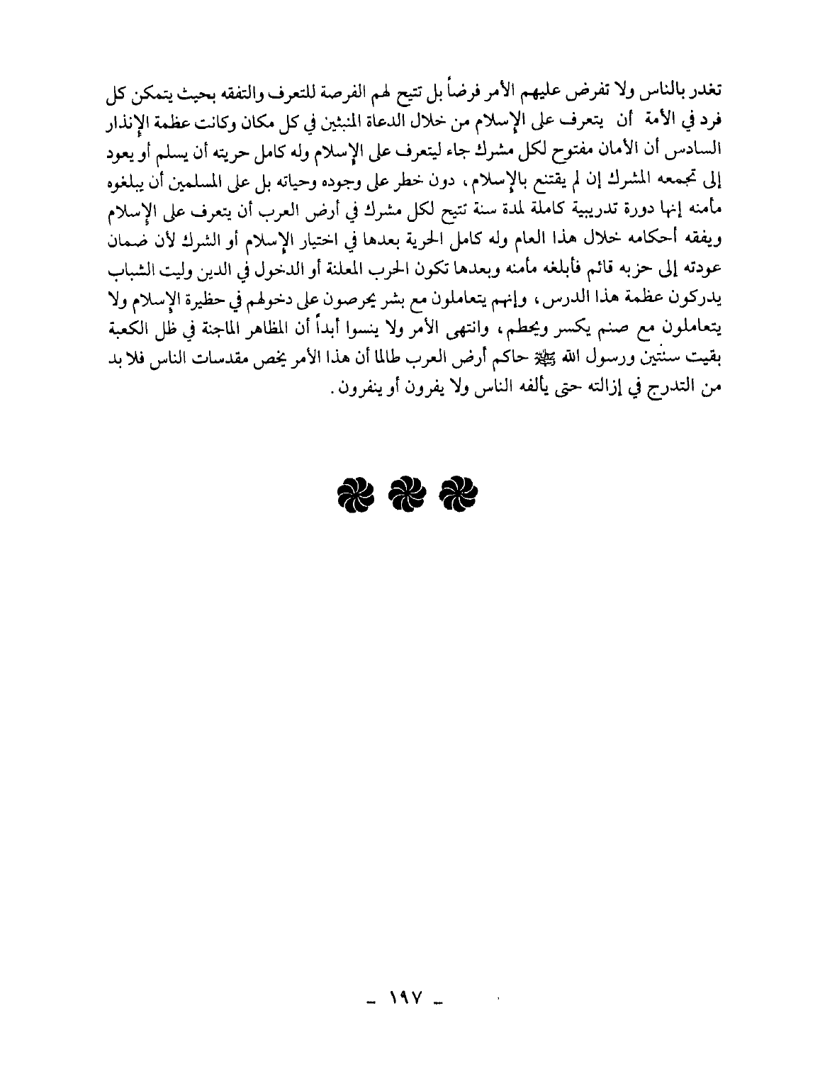تغدر بالناس ولا تفرض عليهم الأمر فرضا بل تتيح لهم الفرصة للتعرف والتفقه بحيث يتمكن كل فرد في الأمة أن يتعرف على الإسلام من خلال الدعاة المنبثين في كل مكان وكانت عظمة الإنذار السادس أن الأمان مفتوح لكل مشرك جاء ليتعرف على الإسلام وله كامل حريته أن يسلم أو يعود إلى تجمعه المشرك إن لم يقتنع بالإسلام، دون خطر على وجوده وحياته بل على المسلمين أن يبلغوه مأمنه إنها دورة تدريبية كاملة لمدة سنة تتيح لكل مشرك في أرض العرب أن يتعرف على الإسلام ويفقه أحكامه خلال هذا العام وله كامل الحرية بعدها في اختيار الإسلام أو الشرك لأن ضمان عودته إلى حزبه قائم فأبلغه مأمنه وبعدها تكون الحرب المعلنة أو الدخول في الدين وليت الشباب يدركون عظمة هذا الدرس، وإنهم يتعاملون مع بشر يحرصون على دخولهم في حظيرة الإسلام ولا يتعاملون مع صنم يكسر ويحطم، وانتهى الأمر ولا ينسوا أبدا أن المظاهر الماجنة في ظل الكعبة بقيت سنتين ورسول الله - صلى الله عليه وسلم - حاكم أرض العرب طالما أن هذا الأمر يخص مقدسات الناس فلا بد من التدرج في إزالته حتى يألفه الناس ولا يفرون أو ينفرون.