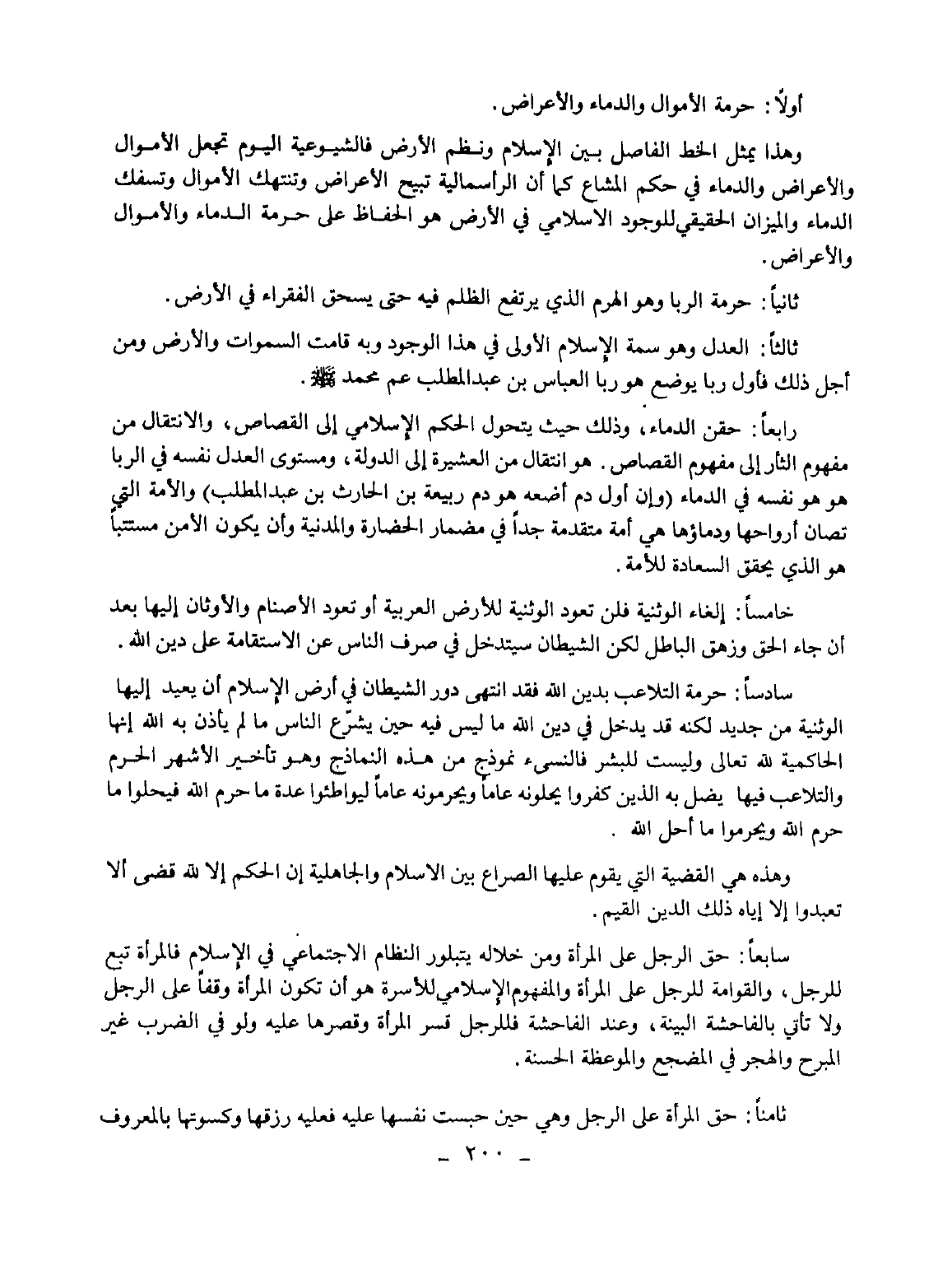 وهذا يمثل الخط الفاصل بين الإسلام ونظم الأرض فالشيوعية اليوم تجعل الأموال والأعراض والدماء في حكم المشاع كما أن الرأسمالية تبيح الأعراض وتنتهك الأموال وتسفك الدماء والميزان الحقيقي للوجود الإسلامي في الأرض هو الحفاظ على حرمة الدماء والأموال والأعراض.