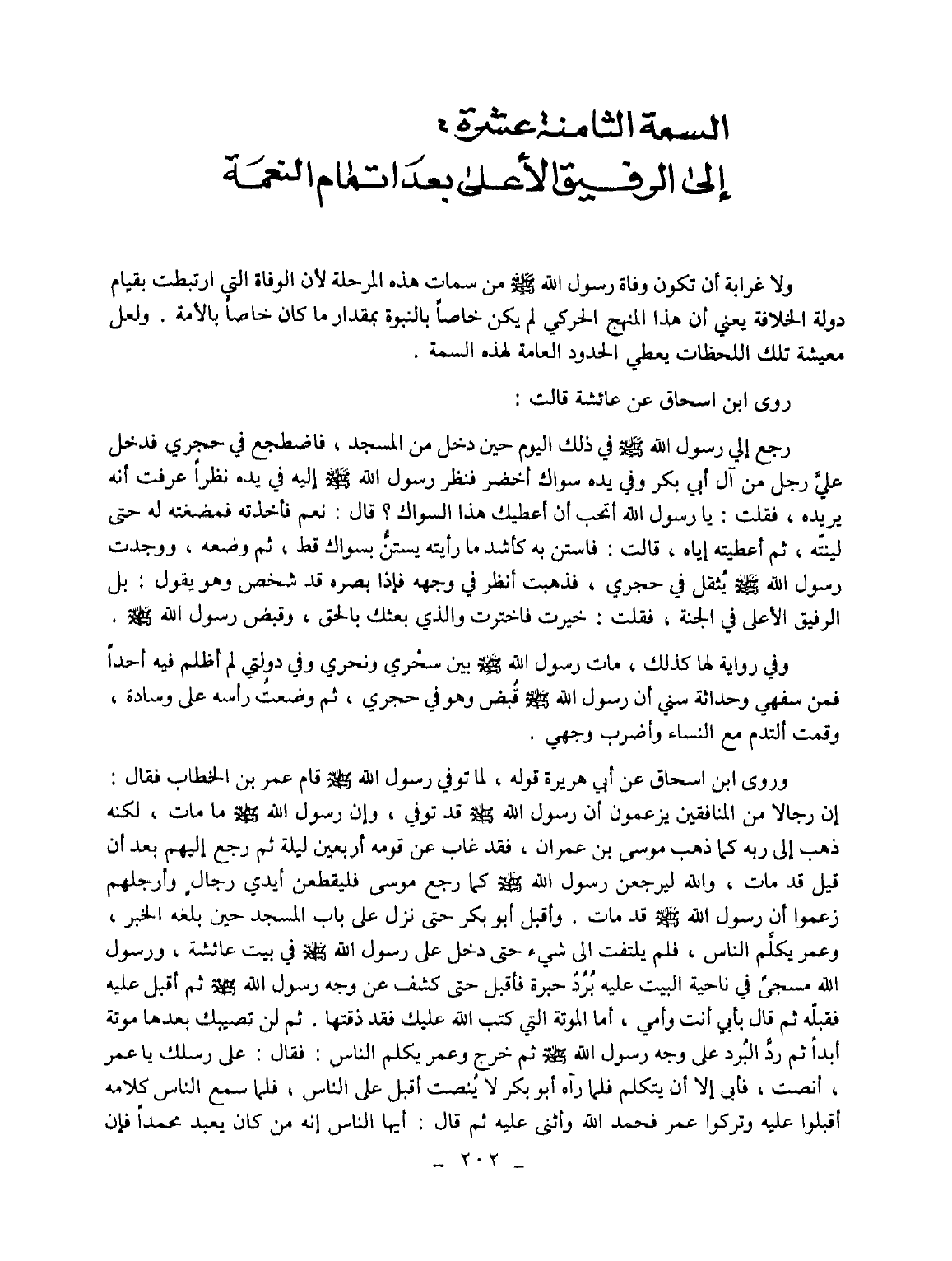 ولا غرابة أن تكون وفاة رسول الله - صلى الله عليه وسلم - من سمات هذه المرحلة لأن الوفاة التي ارتبطت بقيام دولة الخلافة يعني أن هذا المنهج الحركي لم يكن خاصا بالنبوة بمقدار ما كان خاصا بالأمة. ولعل معيشة تلك اللحظات يعطي الحدود العامة لهذه السمة.