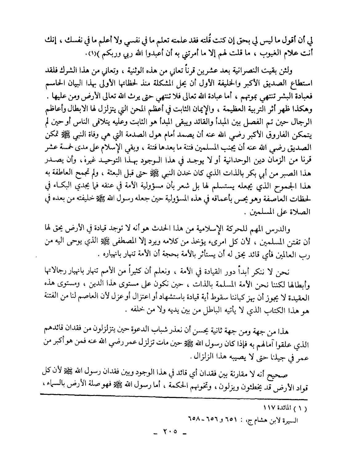 نحن لا ننكر أبدا دور القيادة في الأمة، ونعلم أن كثيرا من الأمم تنهار بانهيار رجالاتها وأبطالها لكننا نحن الأمة المسلمة بالذات، حين نكون على مستوى هذا الدين، ومستوى هذه العقيدة لا يحوز أن يهز كياننا سقوط أية قيادة باستشهاد أو اعتزال أو عزل لأن العاصم لنا من الفتنة هو هذا الكتاب الذي لا يأتيه الباطل من بين يديه ولا من خلفه.