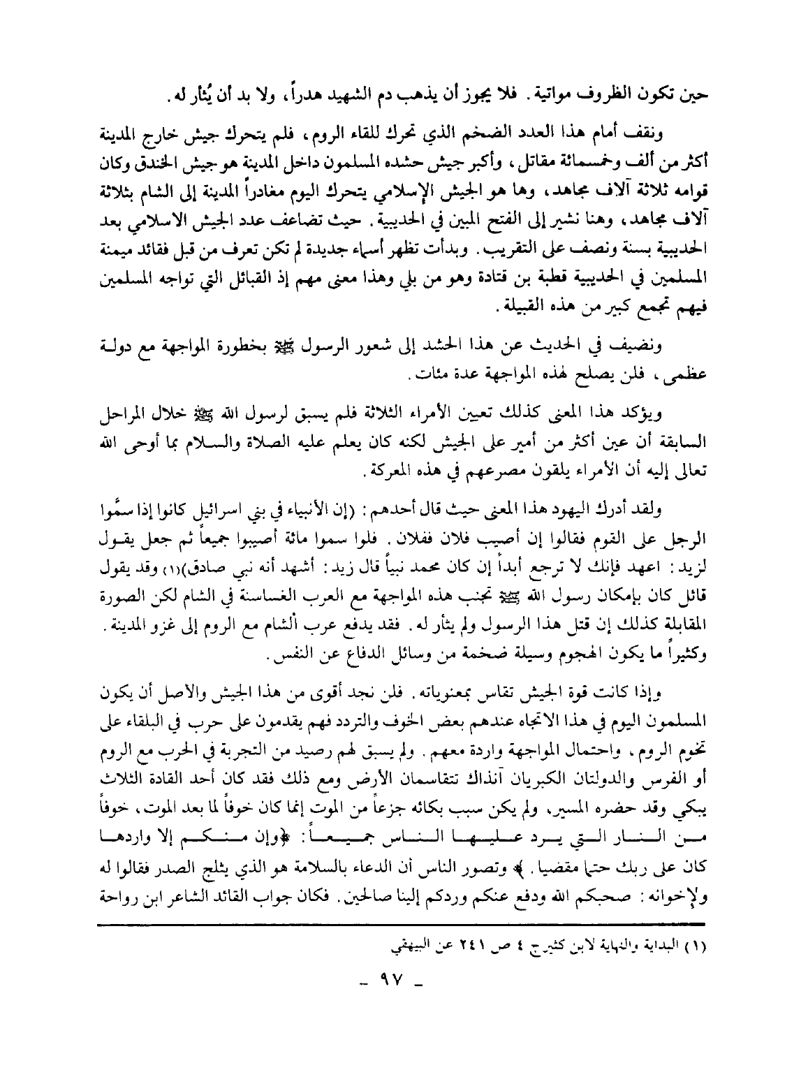 ولقد أدرك اليهود هذا المعنى حيث قال أحدهم: (إن الأنبياء في بنى إسرائيل كانوا إذا سموا الرجل على القوم فقالوا إن أصيب فلان ففلان. فلوا سموا مائة أصيبوا جميعا ثم جعل يقول لزيد: اعهد فإنك لا ترجع أبدا إن كان محمد نبيا قال زيد: أشهد أنه نبي صادق) (¬1) وقد يقول قائل كان بإمكان رسول الله - صلى الله عليه وسلم - تجنب هذه المواجهة مع العرب الغساسنة في الشام لكن الصورة المقابلة كذلك إن قتل هذا الرسول ولم يثأر له. فقد يدفع عرب الشام مع الروم إلى غزو المدينة. وكثيرا ما يكون الهجوم وسيلة ضخمة من وسائل الدفاع عن النفس.