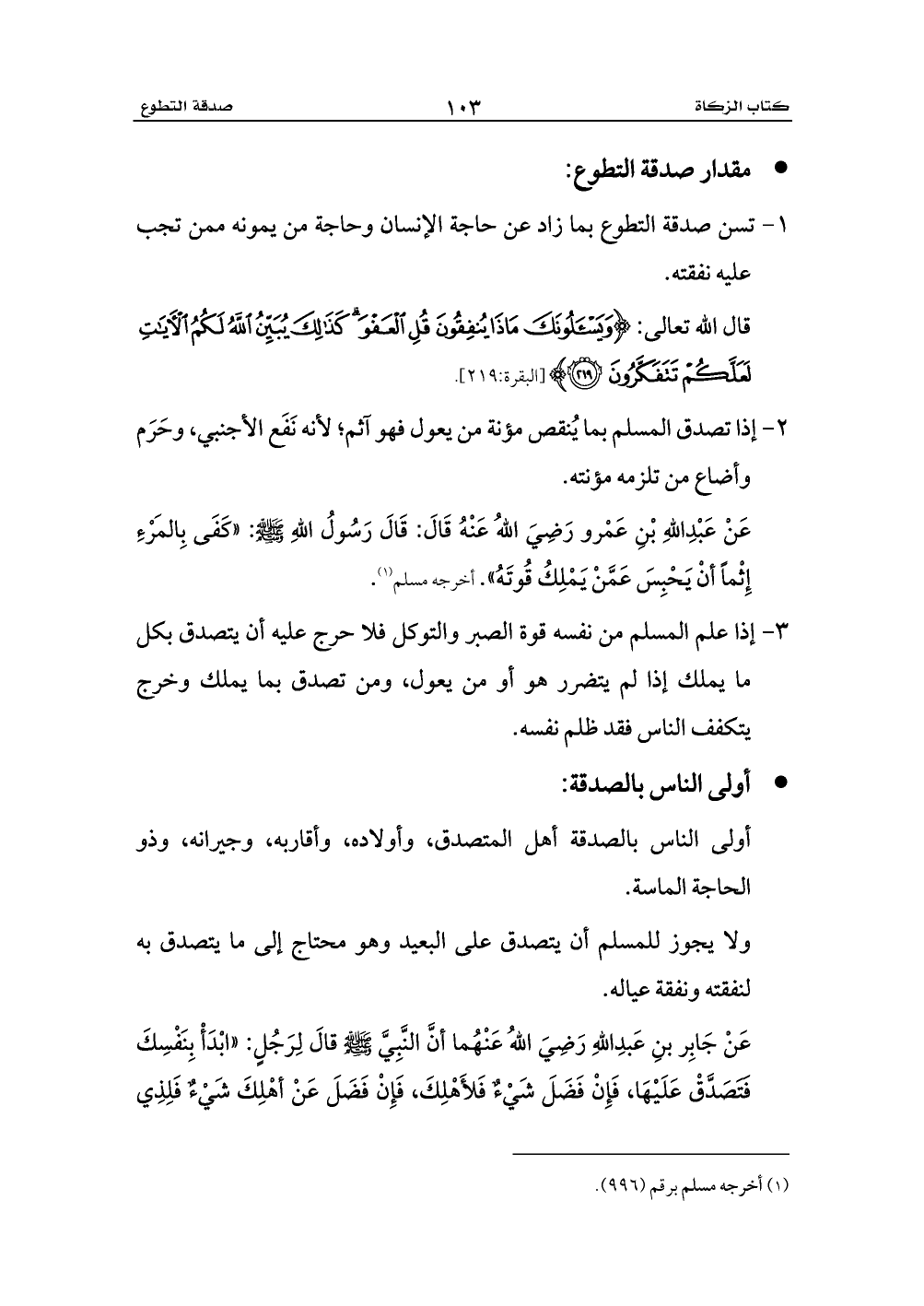 ولا يجوز للمسلم أن يتصدق على البعيد وهو محتاج إلى ما يتصدق به لنفقته ونفقة عياله.