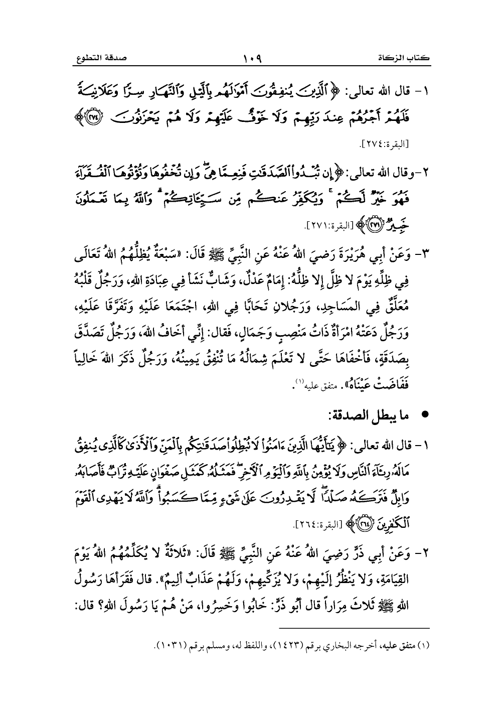 3 - وَعَنْ أبِي هُرَيْرَةَ رَضيَ اللهُ عَنْهُ عَنِ النَّبِيِّ - صلى الله عليه وسلم - قَالَ: «سَبْعَةٌ يُظِلُّهُمُ اللهُ تَعَالَى فِي ظِلِّهِ يَوْمَ لا ظِلَّ إِلا ظِلُّهُ: إِمَامٌ عَدْلٌ، وَشَابٌّ نَشَأ فِي عِبَادَةِ اللهِ، وَرَجُلٌ قَلْبُهُ مُعَلَّقٌ فِي المَسَاجِدِ، وَرَجُلانِ تَحَابَّا فِي اللهِ، اجْتَمَعَا عَلَيْهِ وَتَفَرَّقَا عَلَيْهِ، وَرَجُلٌ دَعَتْهُ امْرَأةٌ ذَاتُ مَنْصِبٍ وَجَمَالٍ، فَقال: إِنِّي أخَافُ اللهَ، وَرَجُلٌ تَصَدَّقَ بِصَدَقَةٍ، فَأخْفَاهَا حَتَّى لا تَعْلَمَ شِمَالُهُ مَا تُنْفِقُ يَمِينُهُ، وَرَجُلٌ ذَكَرَ اللهَ خَالِياً فَفَاضَتْ عَيْنَاهُ». متفق عليه (¬1).