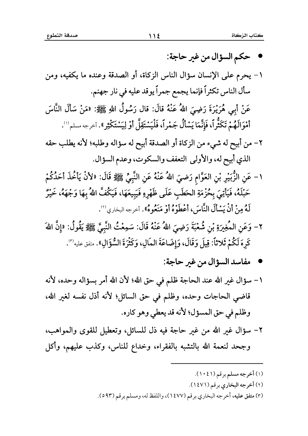 1 - يحرم على الإنسان سؤال الناس الزكاة، أو الصدقة وعنده ما يكفيه، ومن سأل الناس تكثراً فإنما يجمع جمراً يوقد عليه في نار جهنم.
