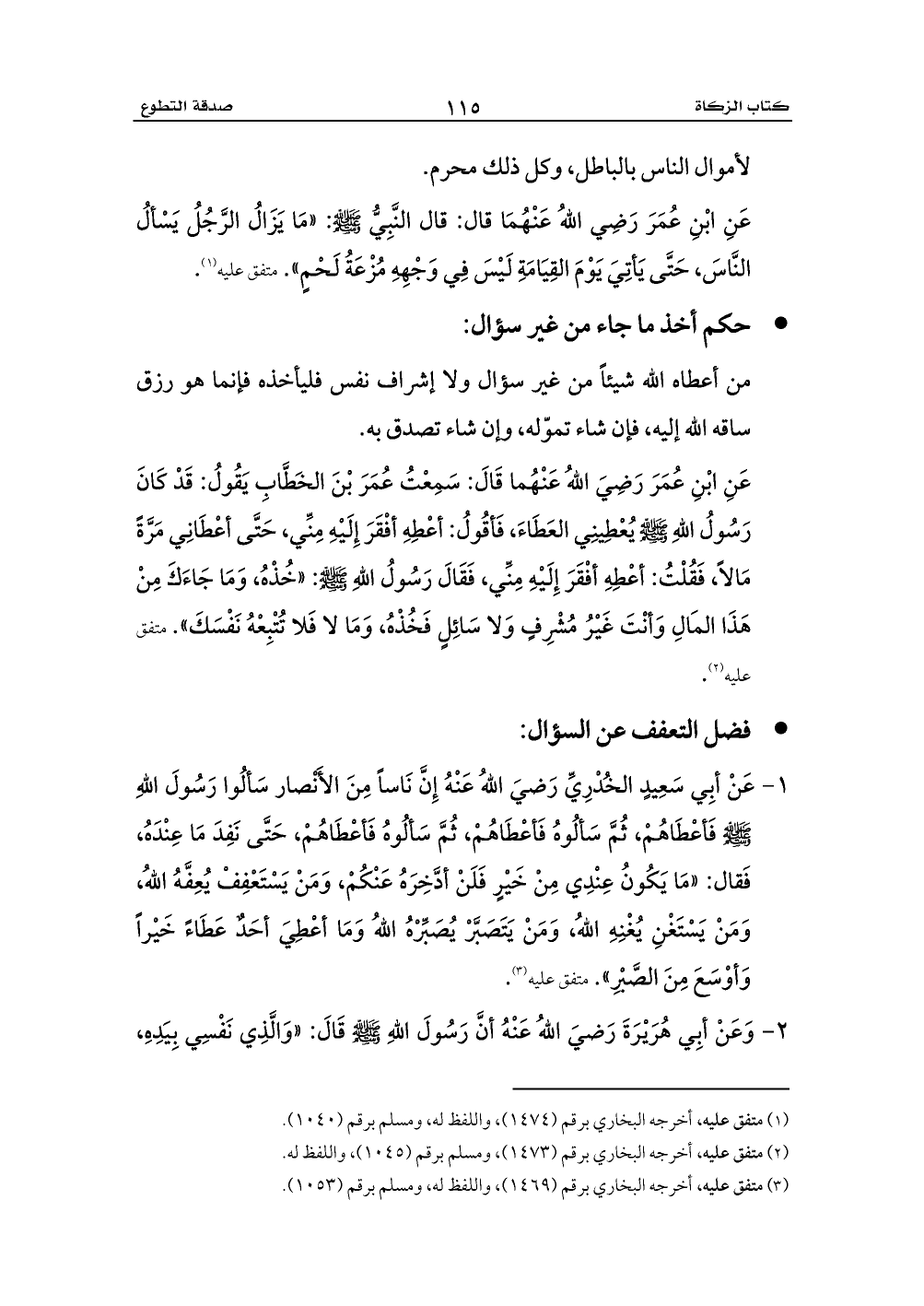 عَنِ ابْنِ عُمَرَ رَضِيَ اللهُ عَنْهُما قَالَ: سَمِعْتُ عُمَرَ بْنَ الخَطَّابِ يَقُولُ: قَدْ كَانَ رَسُولُ اللهِ - صلى الله عليه وسلم - يُعْطِينِي العَطَاءَ، فَأقُولُ: أعْطِهِ أفْقَرَ إِلَيْهِ مِنِّي، حَتَّى أعْطَانِي مَرَّةً مَالاً، فَقُلْتُ: أعْطِهِ أفْقَرَ إِلَيْهِ مِنِّي، فَقَالَ رَسُولُ اللهِ - صلى الله عليه وسلم -: «خُذْهُ، وَمَا جَاءَكَ مِنْ هَذَا المَالِ وَأنْتَ غَيْرُ مُشْرِفٍ وَلا سَائِلٍ فَخُذْهُ، وَمَا لا فَلا تُتْبِعْهُ نَفْسَكَ». متفق عليه (¬2).