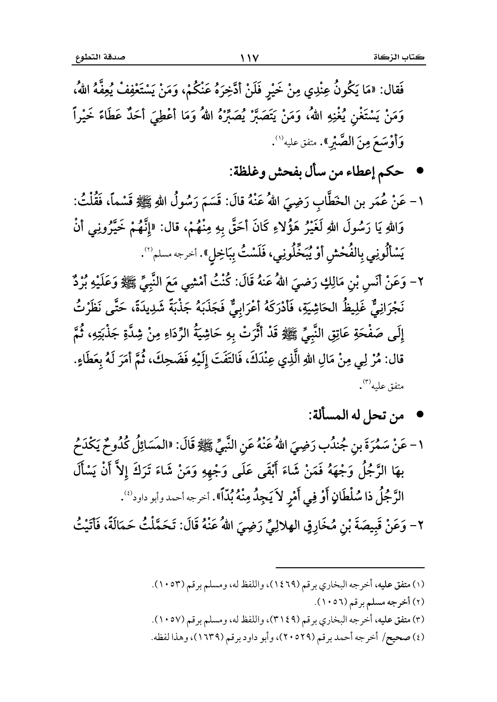 1 - عَنْ سَمُرَةَ بنِ جُندُب رَضِيَ اللهُ عَنْهُ عَنِ النَّبيِّ - صلى الله عليه وسلم - قَالَ: «المَسَائِلُ كُدُوحٌ يَكْدَحُ بهَا الرَّجُلُ وَجْهَهُ فَمَنْ شَاءَ أَبْقَى عَلَى وَجْهِهِ وَمَنْ شَاءَ تَرَكَ إِلاَّ أَنْ يَسْأَلَ الرَّجُلُ ذا سُلْطَانٍ أَوْ فِي أَمْرٍ لاَ يَجِدُ مِنْهُ بُدّاً». أخرجه أحمد وأبو داود (¬4).