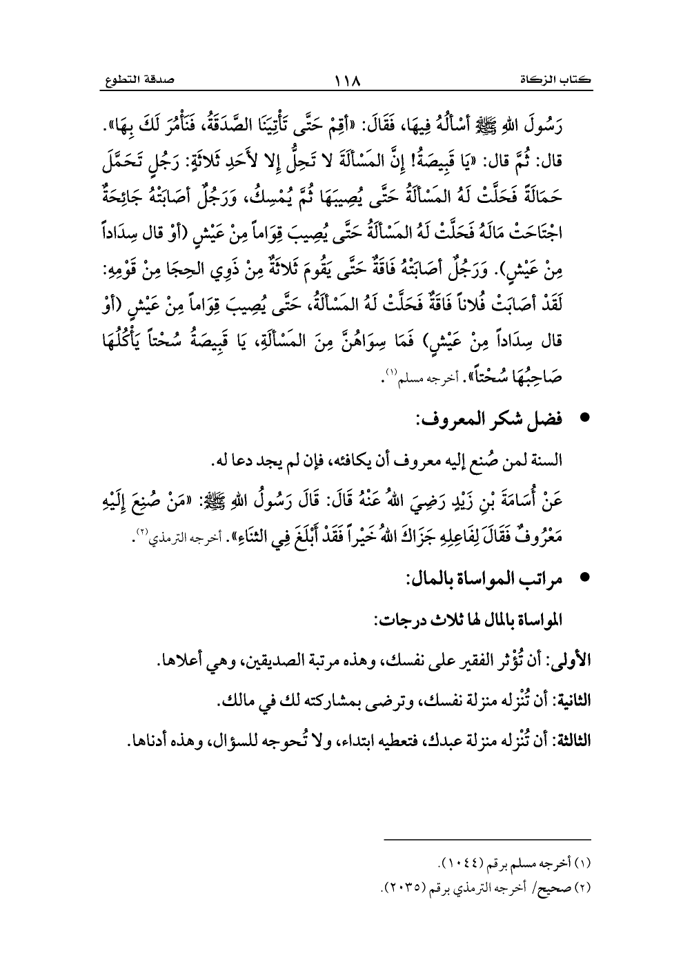 رَسُولَ اللهِ - صلى الله عليه وسلم - أسْألُهُ فِيهَا، فَقَالَ: «أقِمْ حَتَّى تَأْتِيَنَا الصَّدَقَةُ، فَنَأْمُرَ لَكَ بِهَا». قال: ثُمَّ قال: «يَا قَبِيصَةُ! إِنَّ المَسْألَةَ لا تَحِلُّ إِلا لأَحَدِ ثَلاثَةٍ: رَجُلٍ تَحَمَّلَ حَمَالَةً فَحَلَّتْ لَهُ المَسْألَةُ حَتَّى يُصِيبَهَا ثُمَّ يُمْسِكُ، وَرَجُلٌ أصَابَتْهُ جَائِحَةٌ اجْتَاحَتْ مَالَهُ فَحَلَّتْ لَهُ المَسْألَةُ حَتَّى يُصِيبَ قِوَاماً مِنْ عَيْشٍ (أوْ قال سِدَاداً مِنْ عَيْشٍ). وَرَجُلٌ أصَابَتْهُ فَاقَةٌ حَتَّى يَقُومَ ثَلاثَةٌ مِنْ ذَوِي الحِجَا مِنْ قَوْمِهِ: لَقَدْ أصَابَتْ فُلاناً فَاقَةٌ فَحَلَّتْ لَهُ المَسْألَةُ، حَتَّى يُصِيبَ قِوَاماً مِنْ عَيْشٍ (أوْ قال سِدَاداً مِنْ عَيْشٍ) فَمَا سِوَاهُنَّ مِنَ المَسْألَةِ، يَا قَبِيصَةُ سُحْتاً يَأْكُلُهَا صَاحِبُهَا سُحْتاً». أخرجه مسلم (¬1).