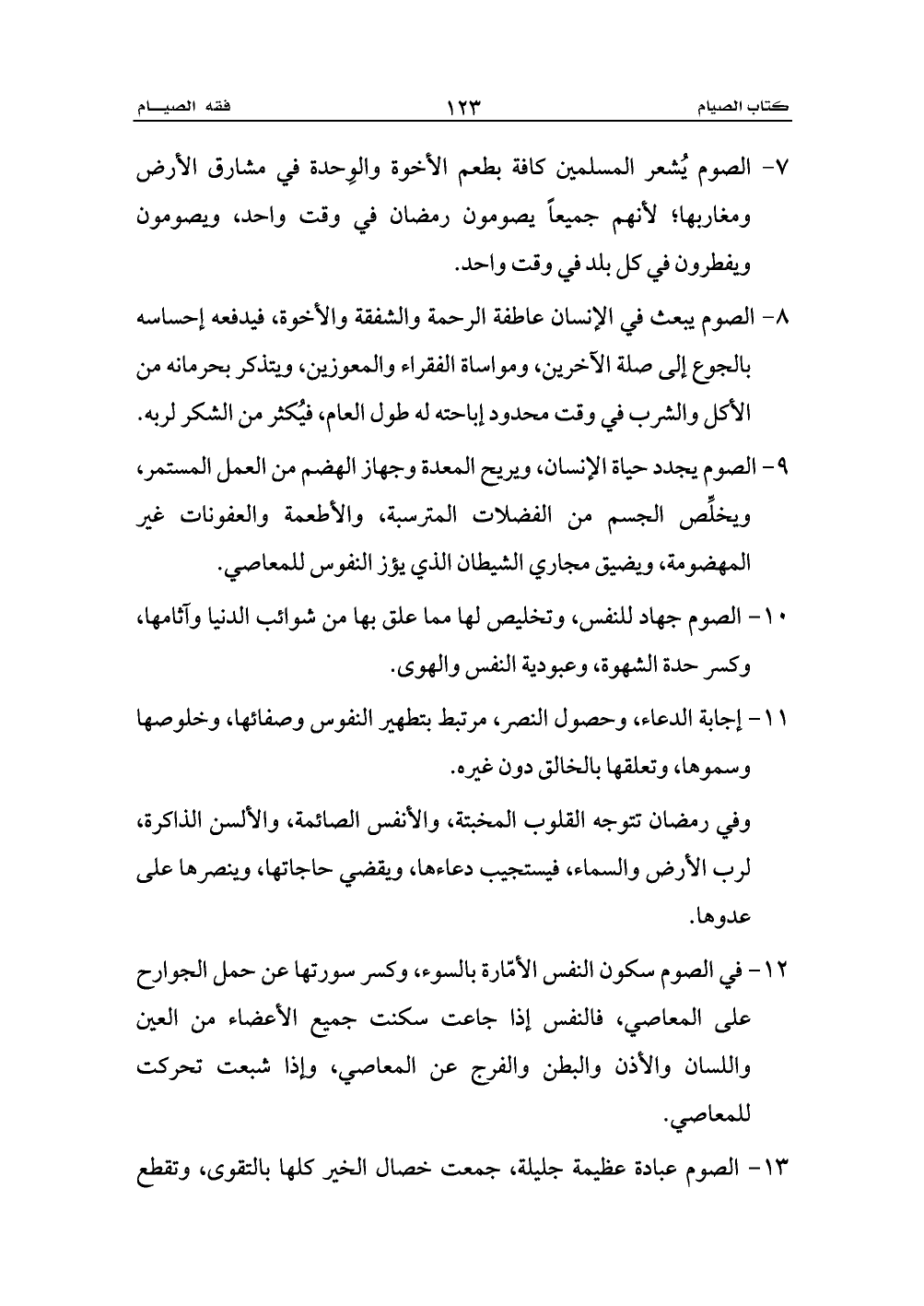10 - الصوم جهاد للنفس، وتخليص لها مما علق بها من شوائب الدنيا وآثامها، وكسر حدة الشهوة، وعبودية النفس والهوى.