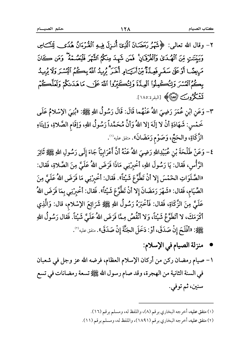 1 - صيام رمضان ركن من أركان الإسلام العظام، فرضه الله عز وجل في شعبان في السنة الثانية من الهجرة، وقد صام رسول الله - صلى الله عليه وسلم - تسعة رمضانات في تسع سنين، ثم توفي.