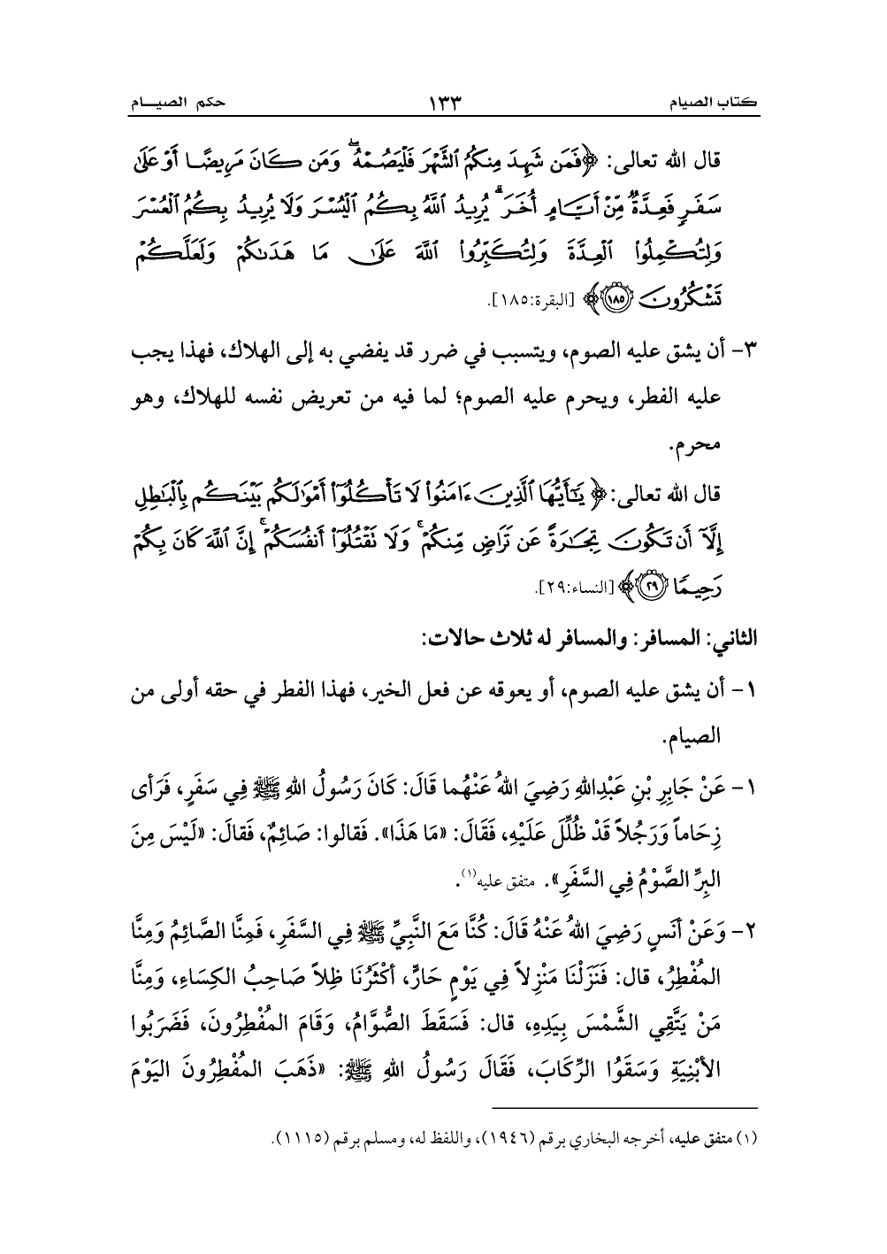 1 - عَنْ جَابِرِ بْنِ عَبْدِاللهِ رَضِيَ اللهُ عَنْهُما قَالَ: كَانَ رَسُولُ اللهِ - صلى الله عليه وسلم - فِي سَفَرٍ، فَرَأى زِحَاماً وَرَجُلاً قَدْ ظُلِّلَ عَلَيْهِ، فَقَالَ: «مَا هَذَا». فَقالوا: صَائِمٌ، فَقالَ: «لَيْسَ مِنَ البِرِّ الصَّوْمُ فِي السَّفَرِ». متفق عليه (¬1).