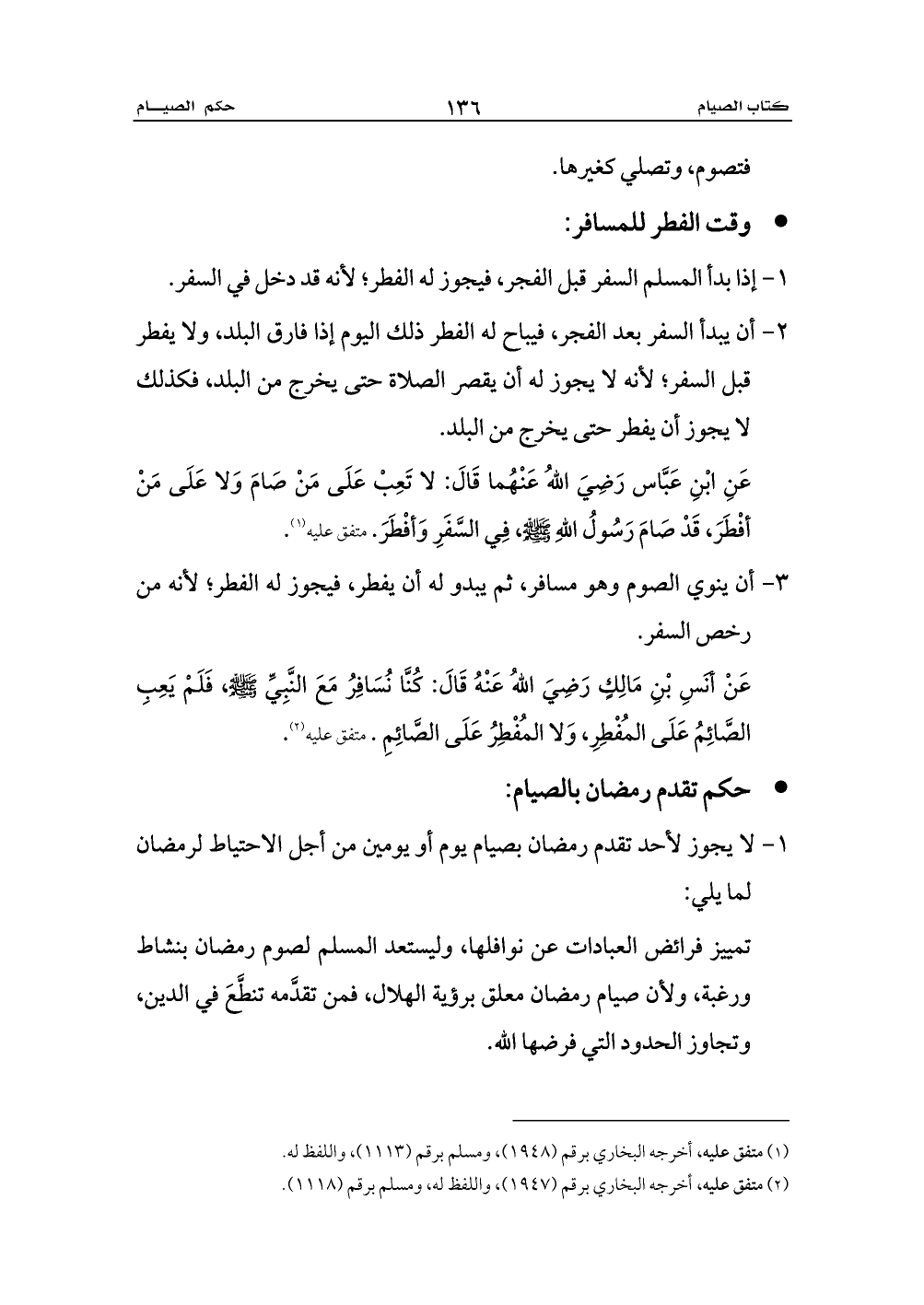 عَنْ أنَسِ بْنِ مَالِكٍ رَضِيَ اللهُ عَنْهُ قَالَ: كُنَّا نُسَافِرُ مَعَ النَّبِيِّ - صلى الله عليه وسلم -، فَلَمْ يَعِبِ الصَّائِمُ عَلَى المُفْطِرِ، وَلا المُفْطِرُ عَلَى الصَّائِمِ. متفق عليه (¬2).